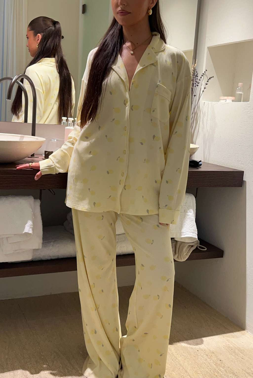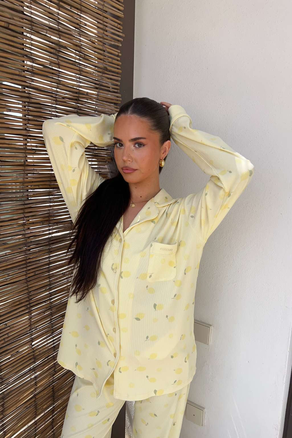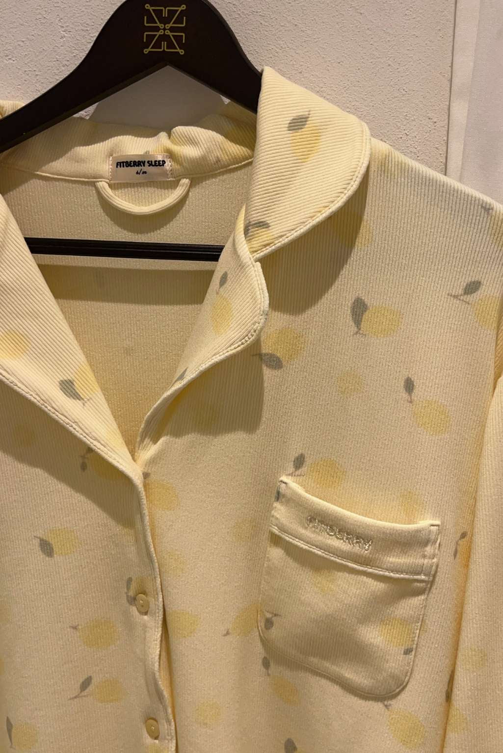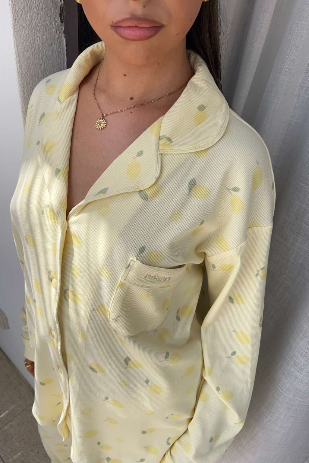 FITBERRY® CITRUS BLOOM PYJAMAS SHIRT. The softest butter yellow pyjamas shirts featuring a delicate all-over citrus lemon print, dropped shoulders, buttoned front, long sleeves, loose fit and FITBERRY® embroidered logo to chest. Crafted from a silky, breathable modal rib with an oversized fit and gentle stretch. This set is perfect for slow mornings and golden hour evenings.
