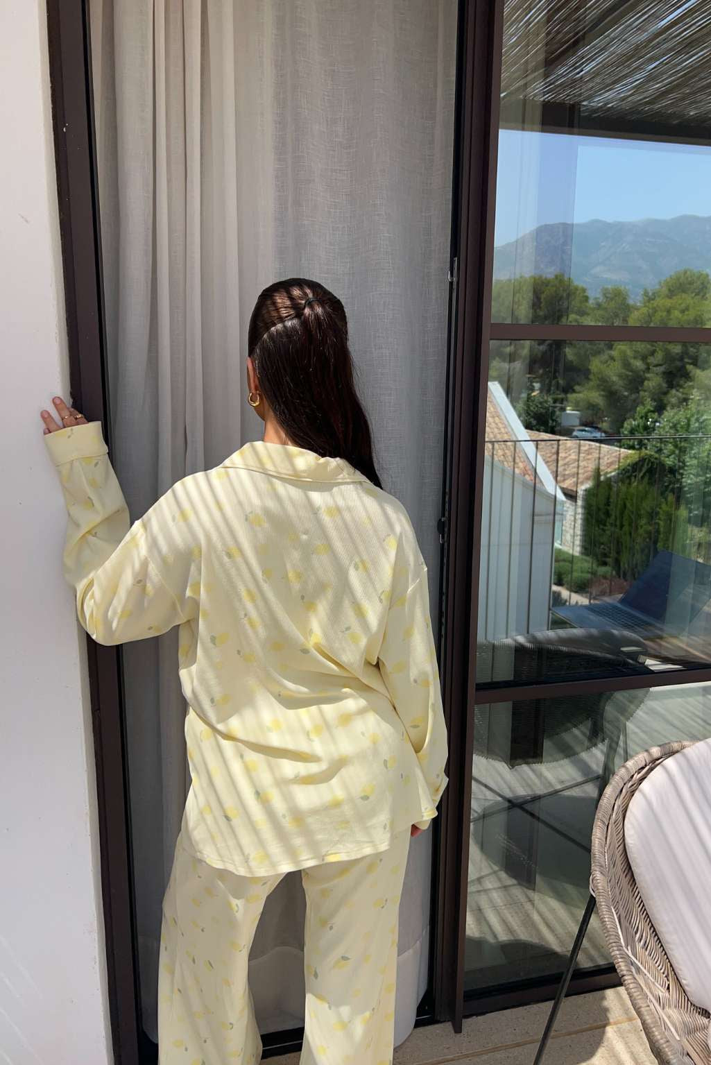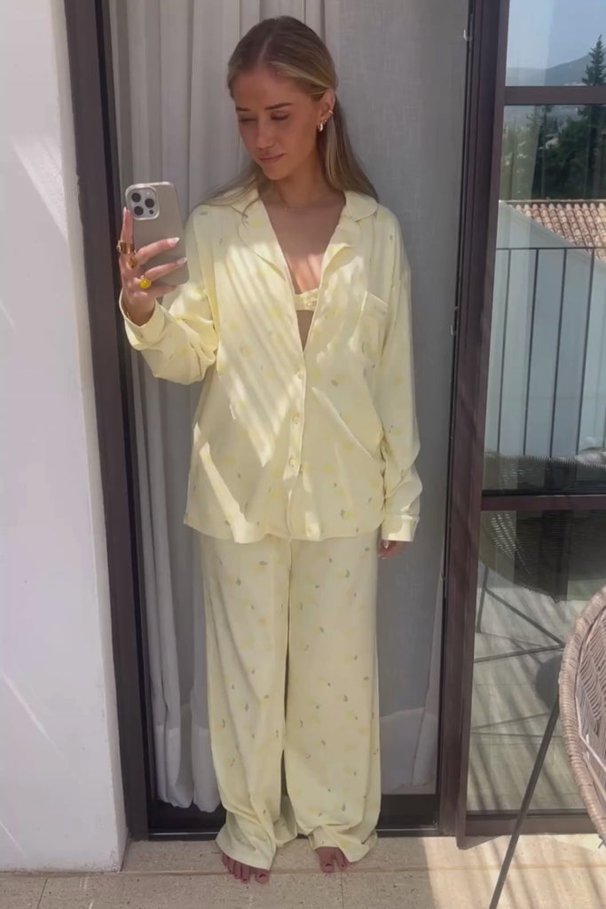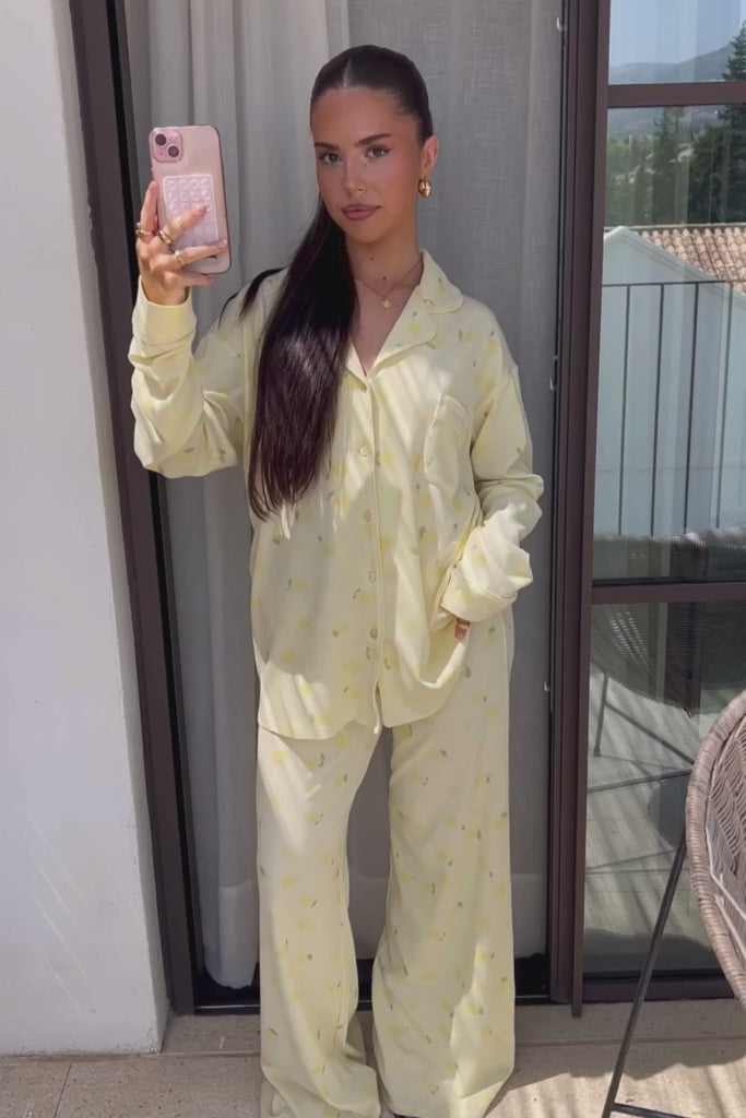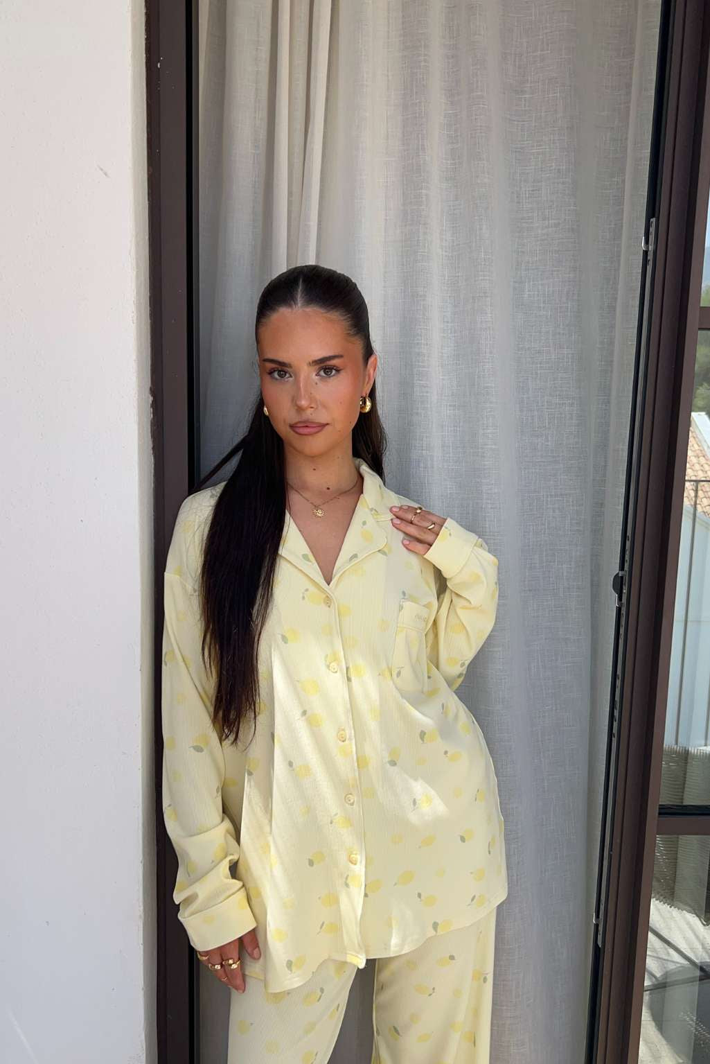 FITBERRY® CITRUS BLOOM PYJAMAS SHIRT. The softest butter yellow pyjamas shirts featuring a delicate all-over citrus lemon print, dropped shoulders, buttoned front, long sleeves, loose fit and FITBERRY® embroidered logo to chest. Crafted from a silky, breathable modal rib with an oversized fit and gentle stretch. This set is perfect for slow mornings and golden hour evenings.