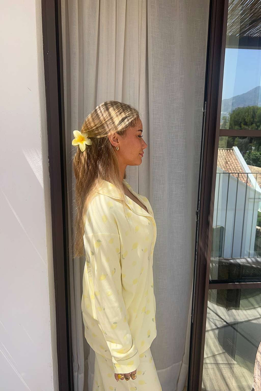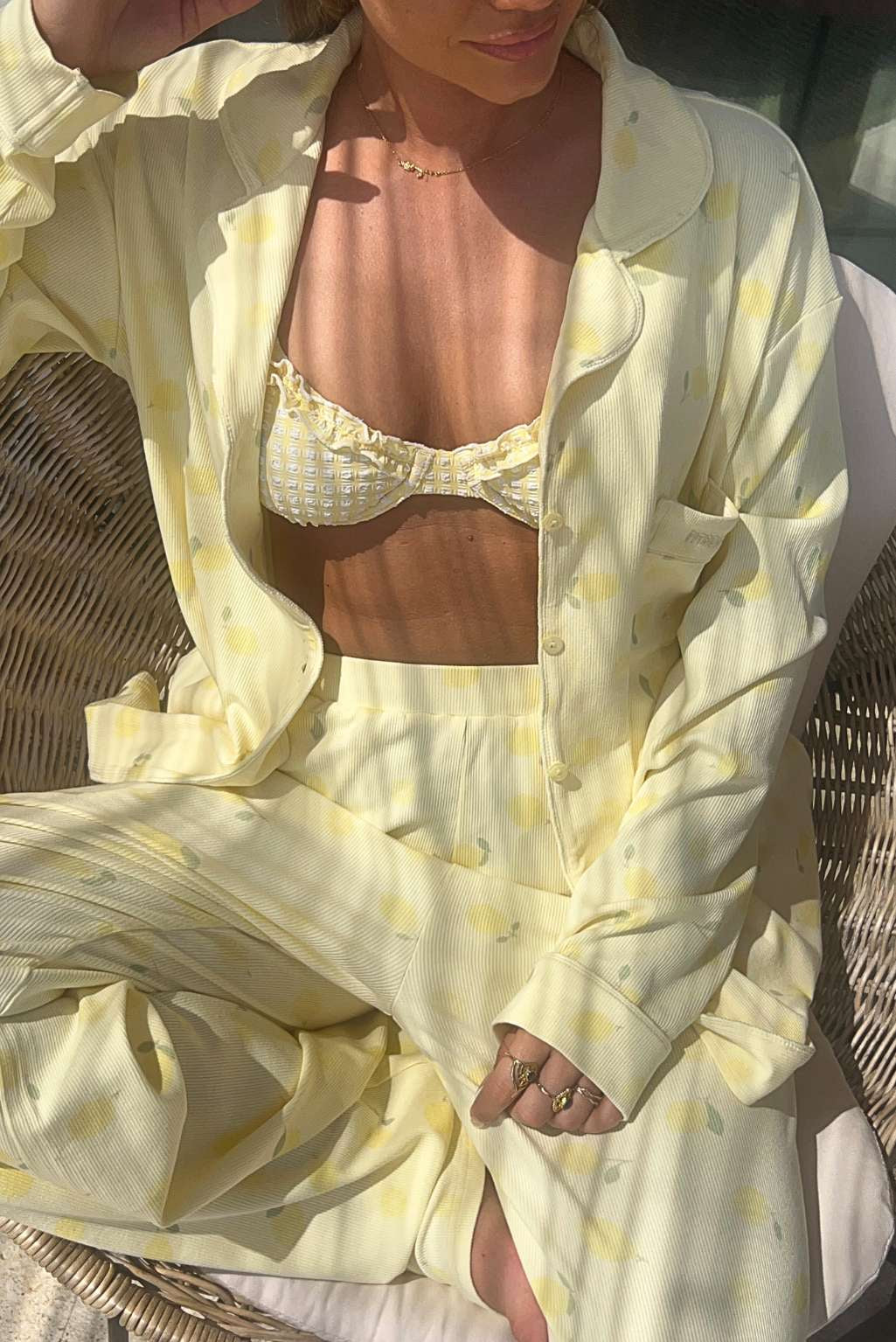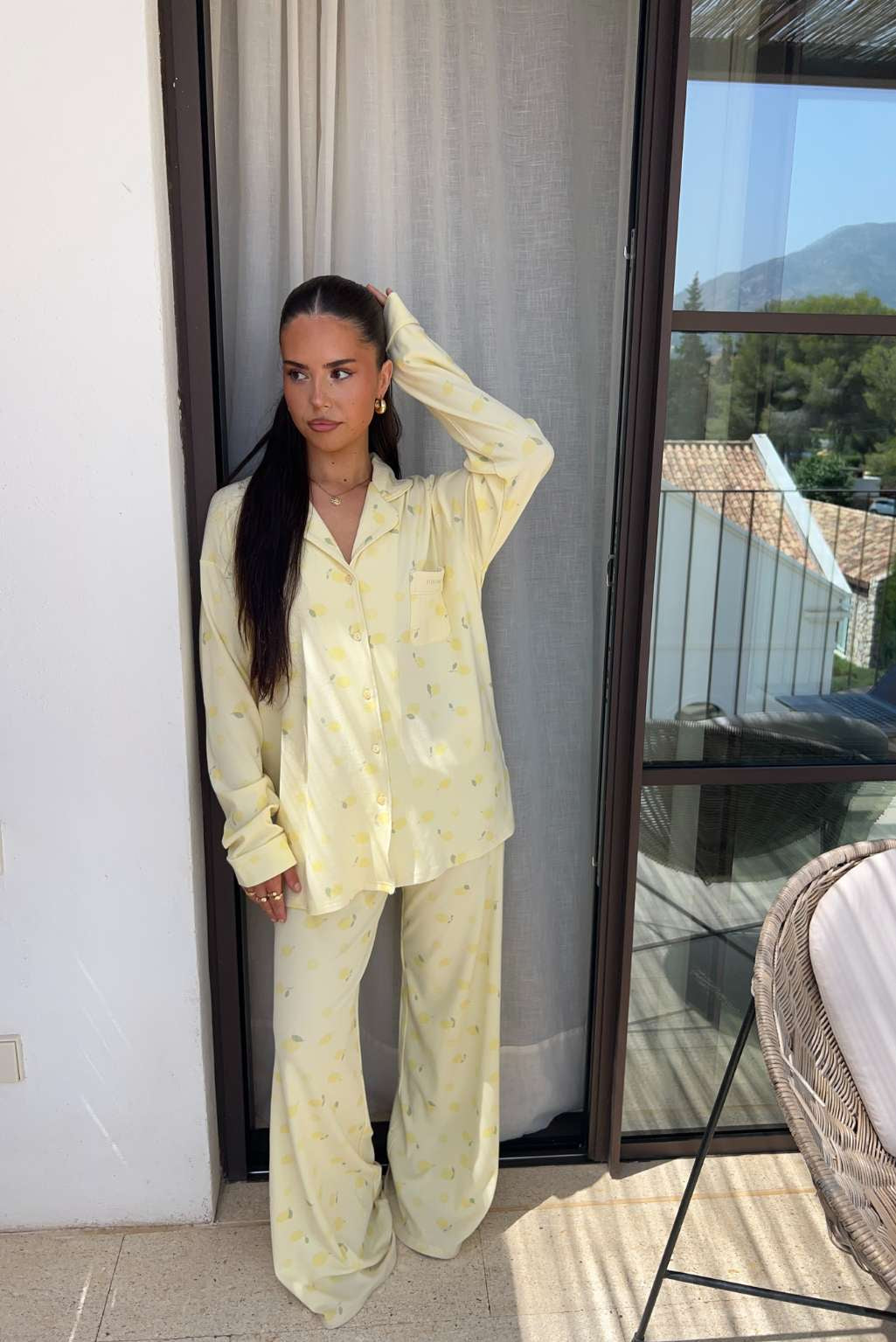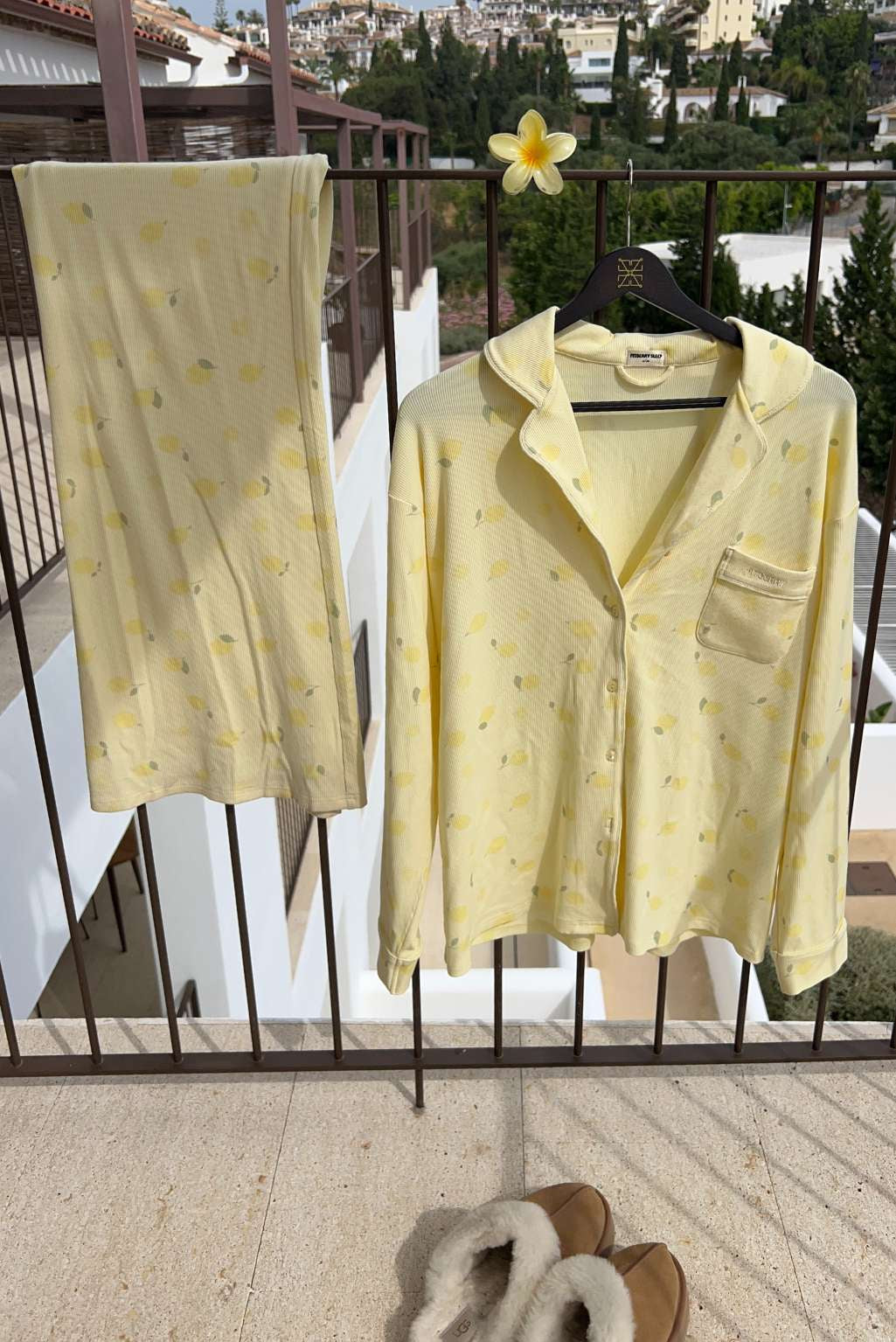 FITBERRY® CITRUS BLOOM PYJAMAS SHIRT. The softest butter yellow pyjamas shirts featuring a delicate all-over citrus lemon print, dropped shoulders, buttoned front, long sleeves, loose fit and FITBERRY® embroidered logo to chest. Crafted from a silky, breathable modal rib with an oversized fit and gentle stretch. This set is perfect for slow mornings and golden hour evenings.