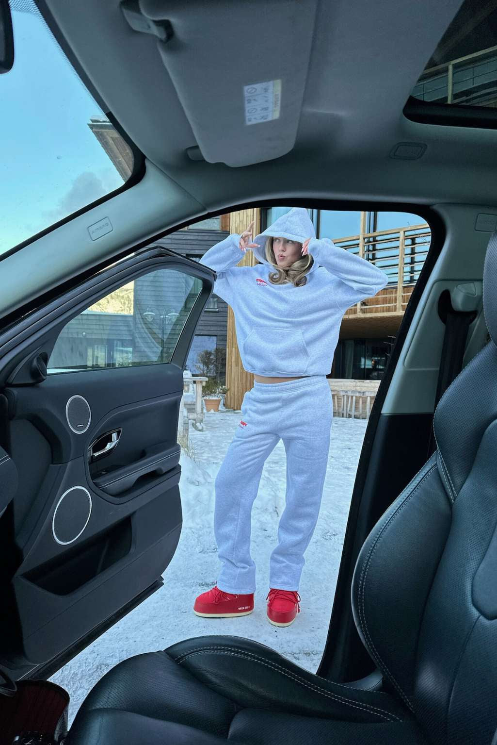 Julie Fiala is 185cm and wears a size L in both hoodie and joggers.