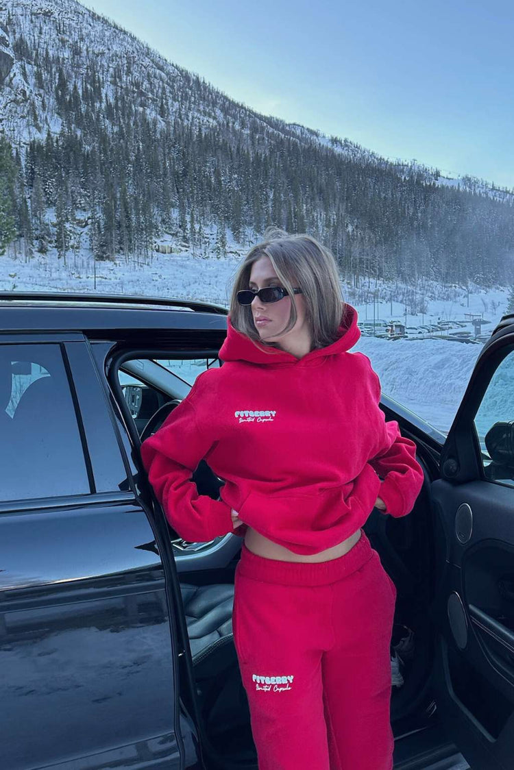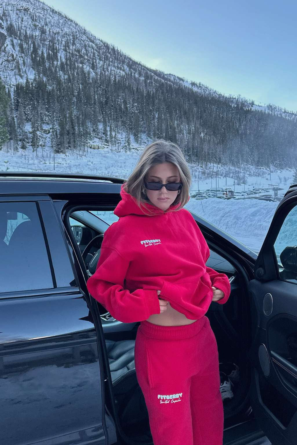 Julie Fiala is 185cm and wears a size L in both hoodie and joggers.