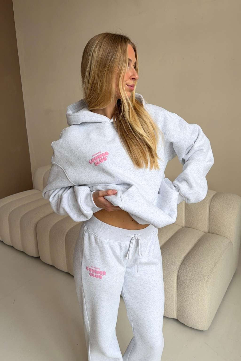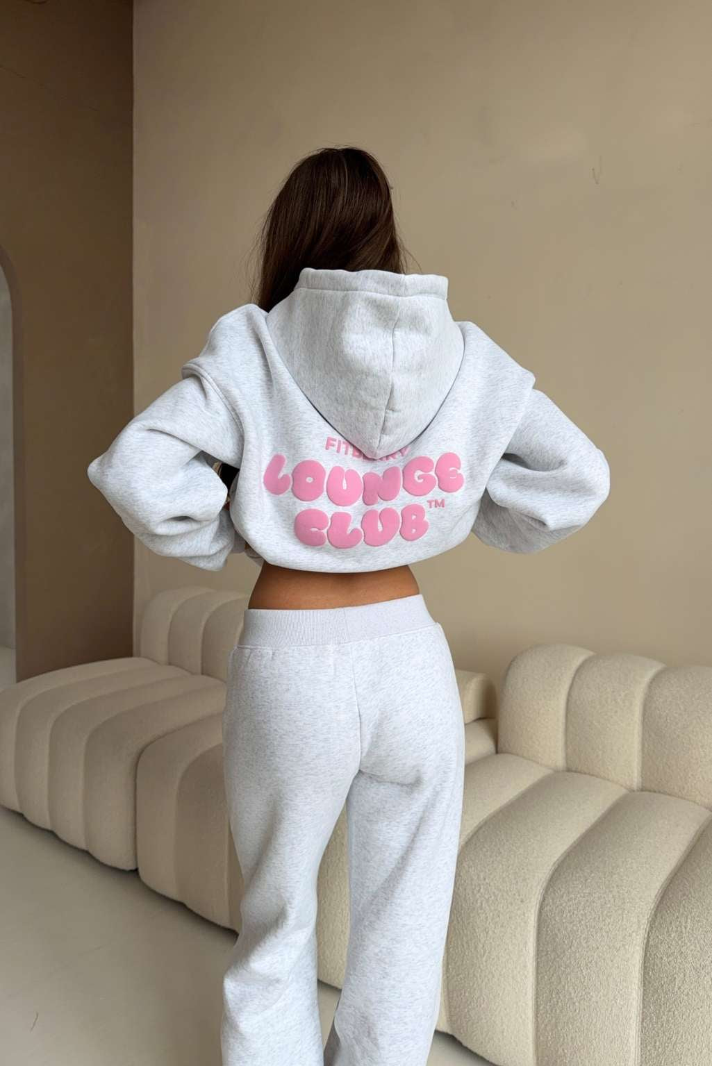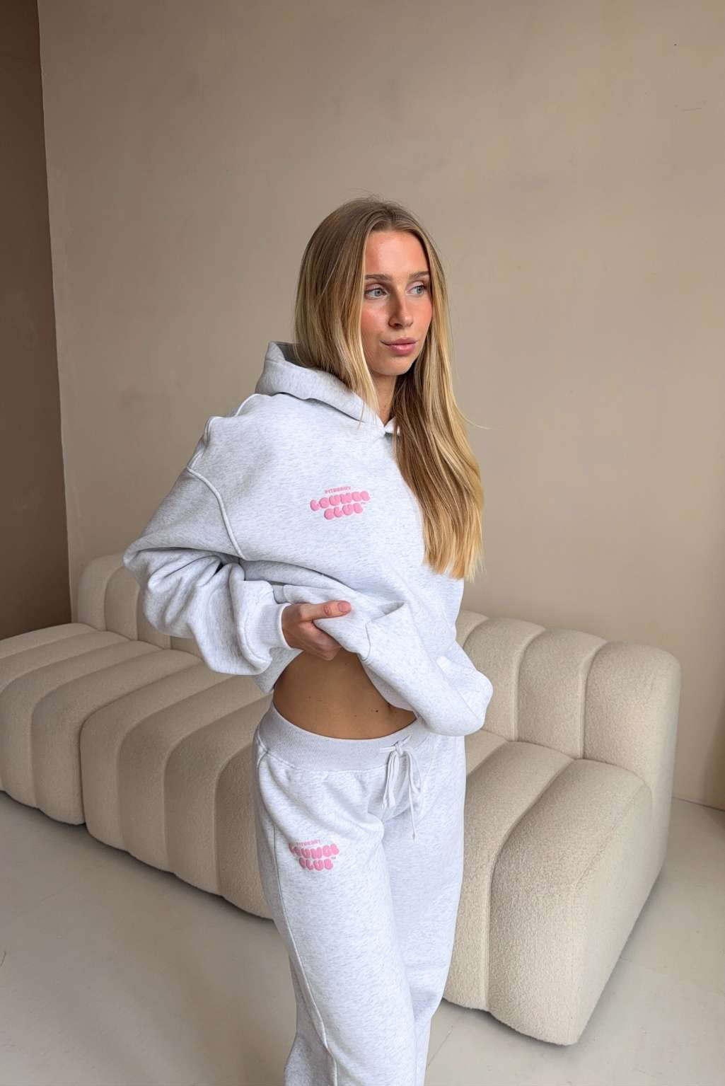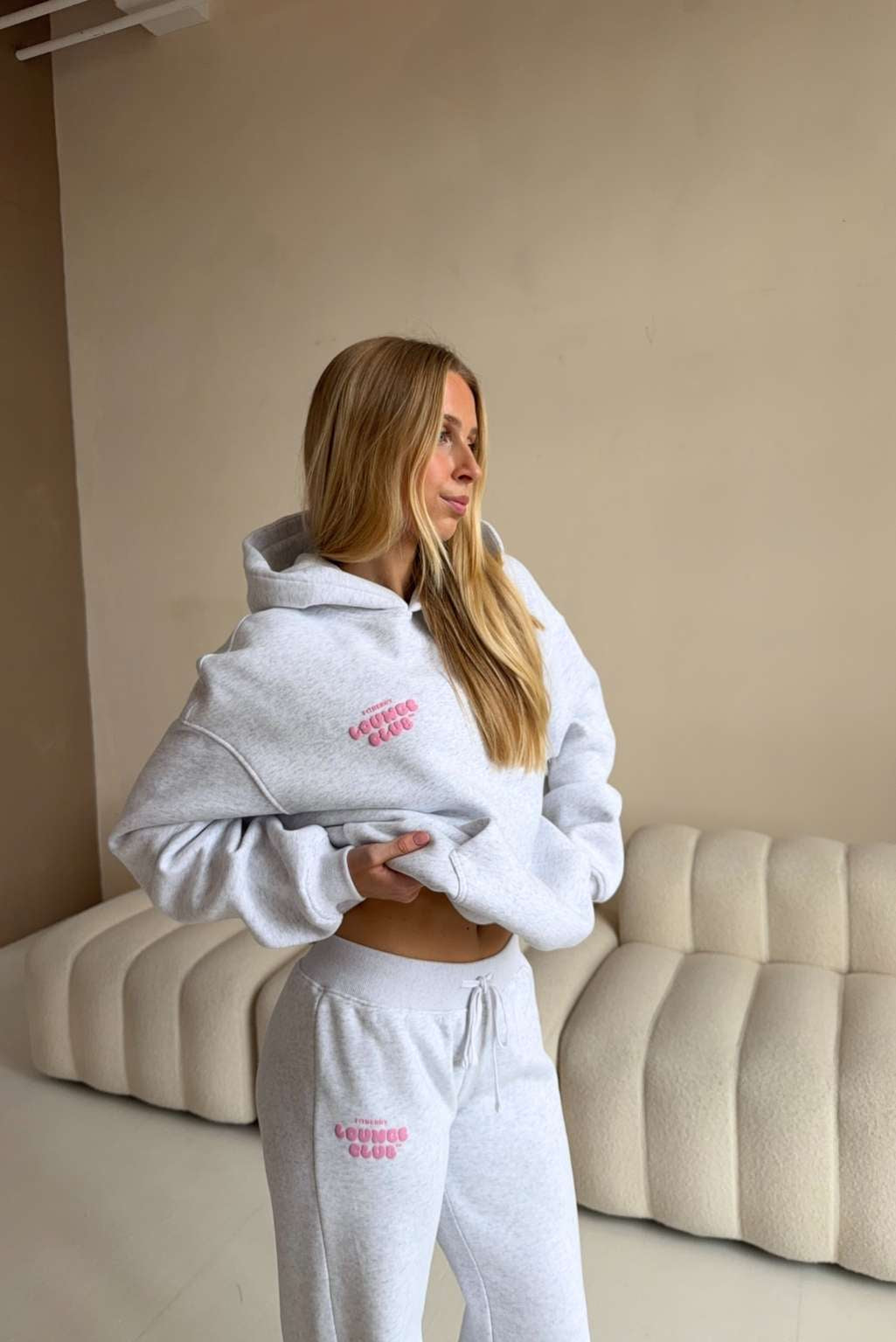 FITBERRY® LOUNGE CLUB OVERSIZED HOODIE. An oversized hoodie crafted from a premium high-quality cotton fabric. The hoodie has a soft fleece interior, dropped shoulders, a cozy hood and ribbed details on the sleeves and waist. Featuring our signature Fitberry Lounge Club print to front and back.