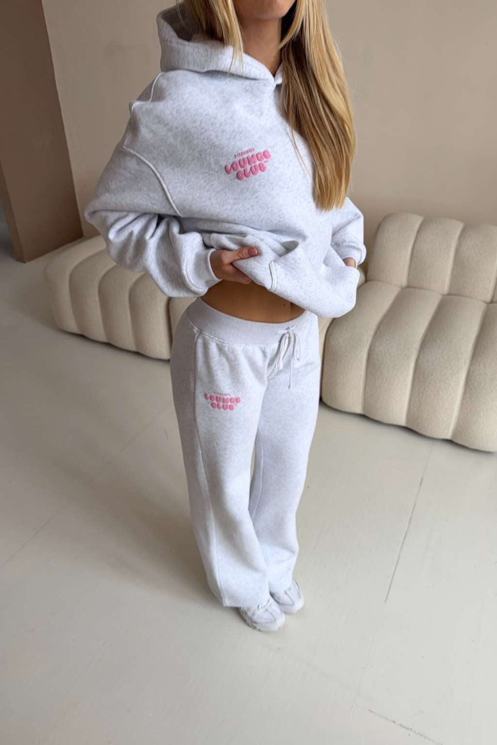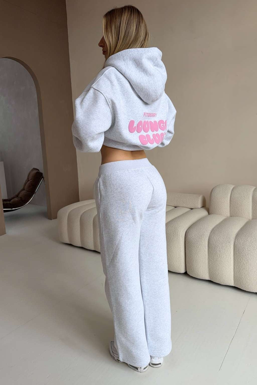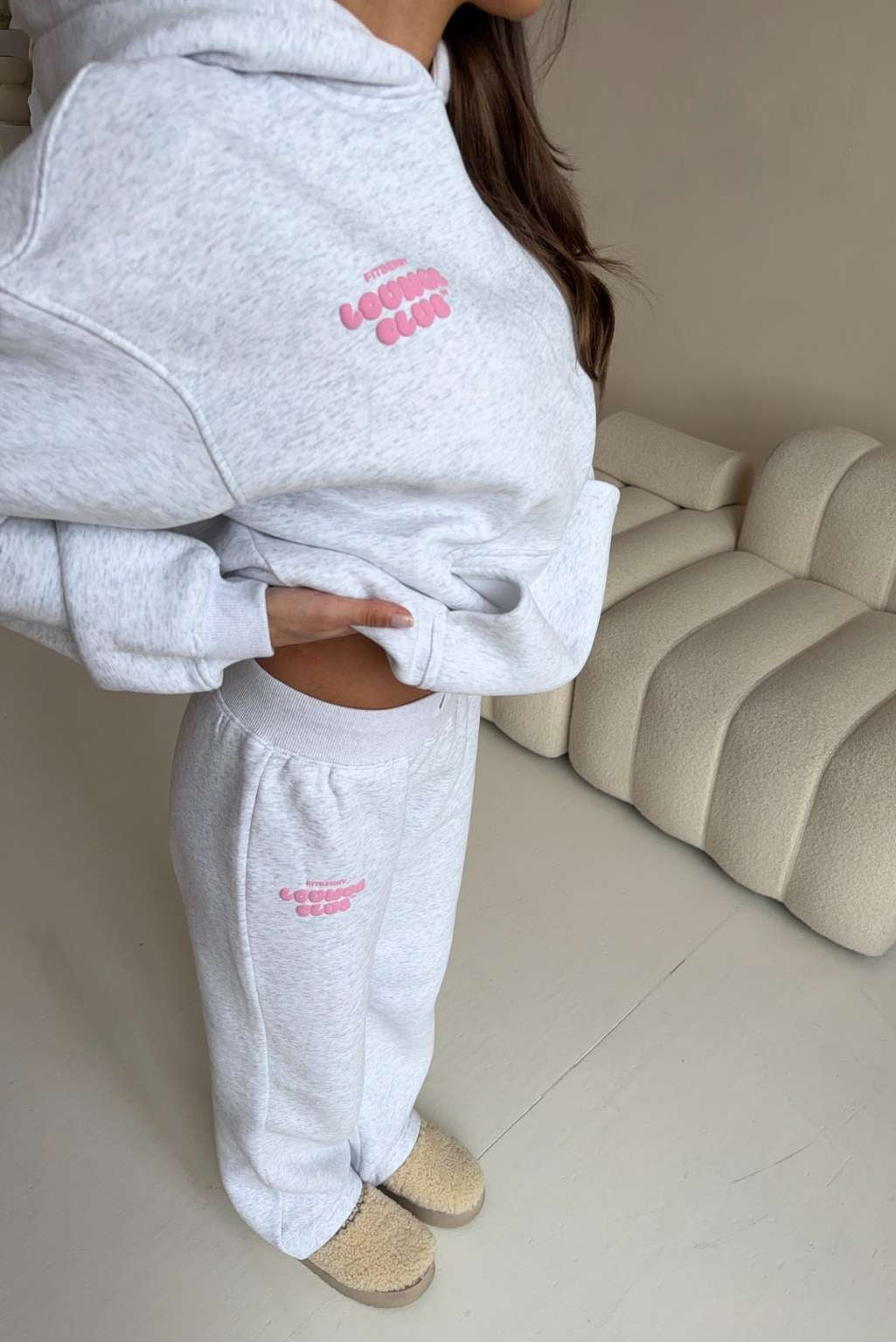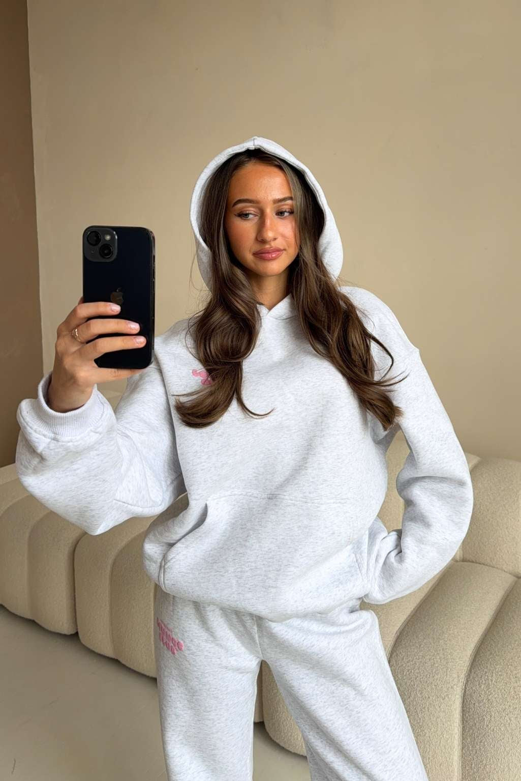 FITBERRY® LOUNGE CLUB OVERSIZED HOODIE. An oversized hoodie crafted from a premium high-quality cotton fabric. The hoodie has a soft fleece interior, dropped shoulders, a cozy hood and ribbed details on the sleeves and waist. Featuring our signature Fitberry Lounge Club print to front and back.