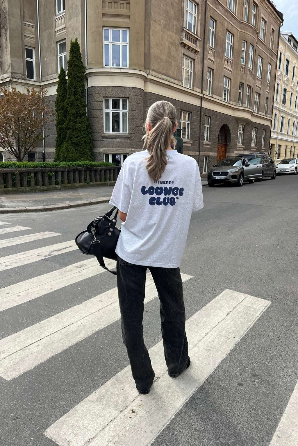 FITBERRY® LOUNGE CLUB OVERSIZED TEE. A t-shirt with an oversized fit. Crafted from a premium high-quality cotton fabric with a soft handfeel. The tee has a round neckline, dropped shoulders, loose sleeves and Fitberry Lounge Club print to front and back.