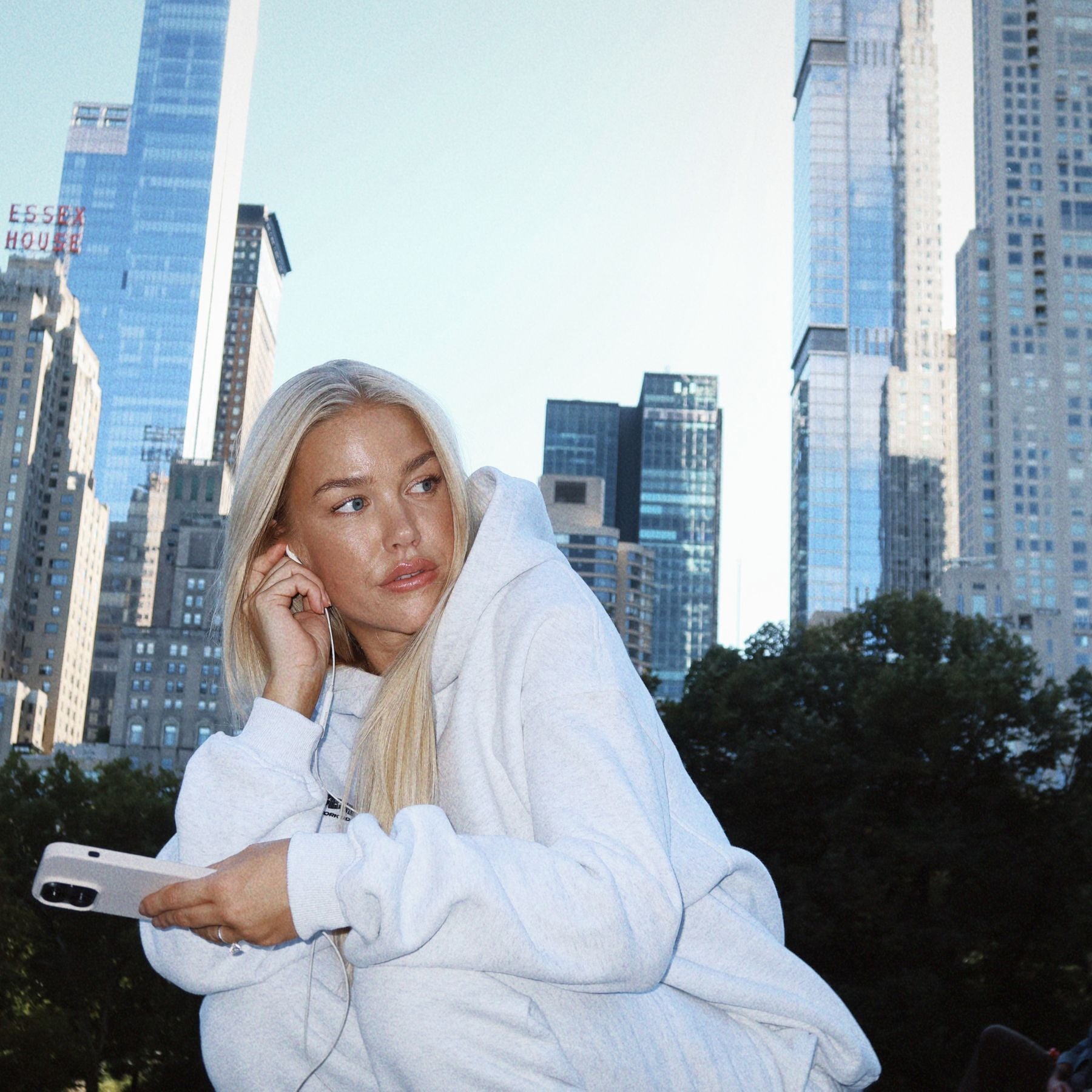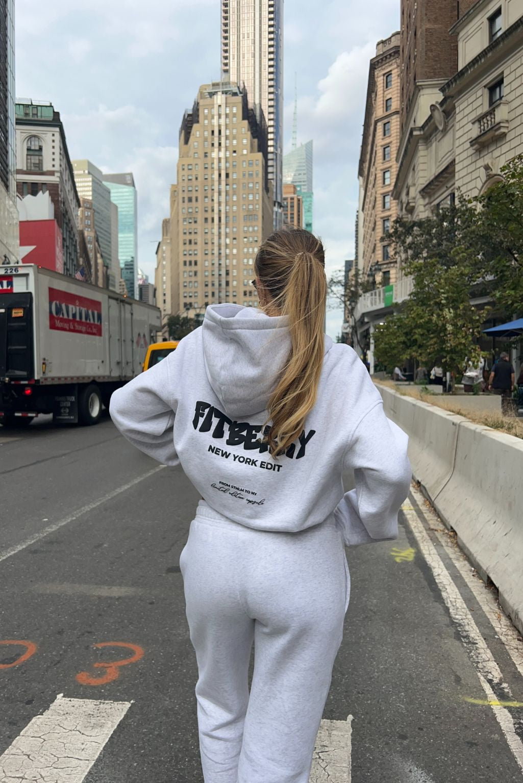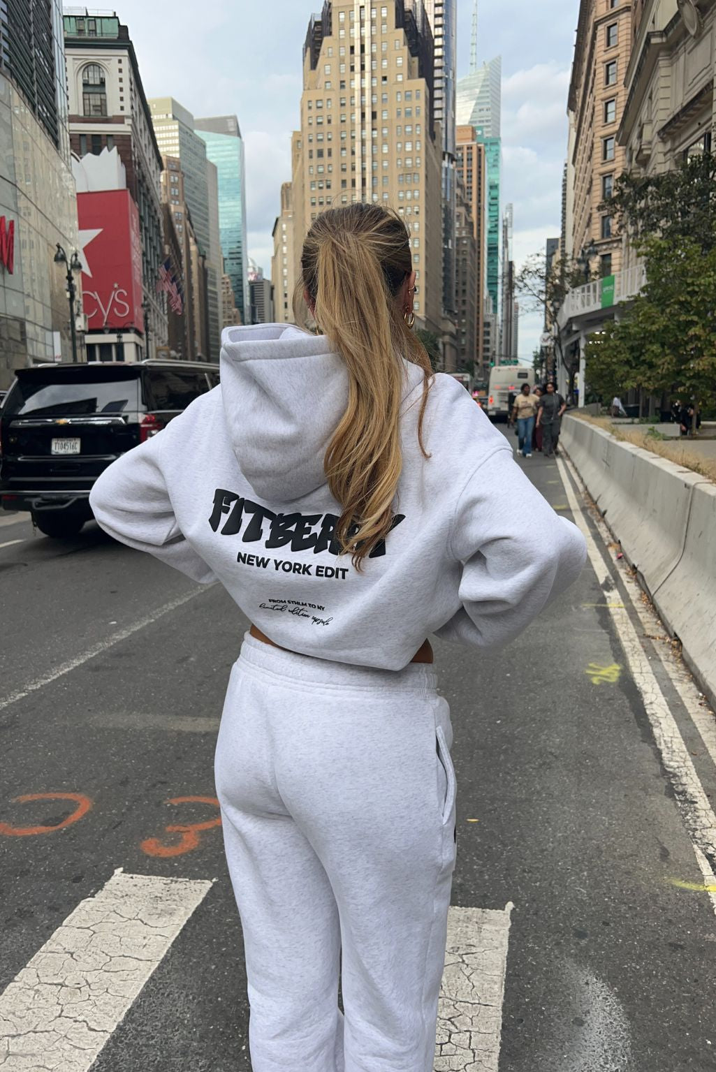 FITBERRY® NEW YORK EDIT OVERSIZED HOODIE. An oversized hoodie crafted from premium high-quality cotton fabric. The hoodie has a soft fleece interior, dropped shoulders, a cozy hood and ribbed details on the sleeves and waist. Featuring Fitberry New York Edit print to front and back.