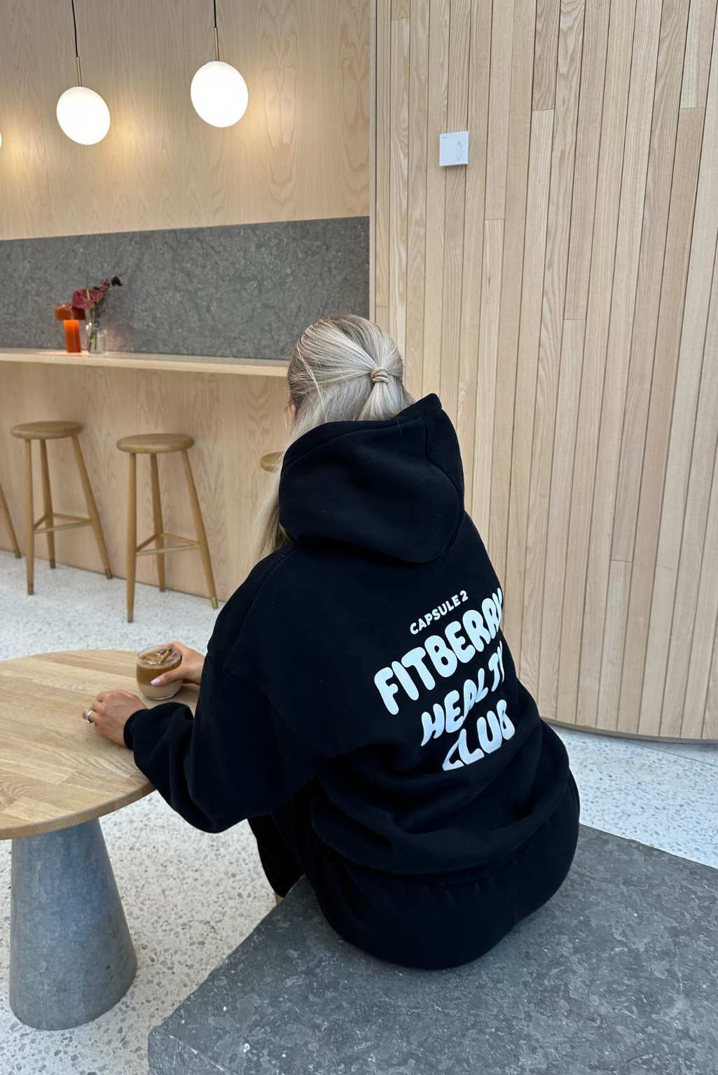 FITBERRY® HEALTH CLUB OVERSIZED HOODIE. An oversized hoodie crafted from a premium high-quality cotton fabric. The hoodie has a soft fleece interior, dropped shoulders, a cozy hood and ribbed details on the sleeves and waist. Featuring our signature Fitberry Health Club Capsule 2 logo to front and back.