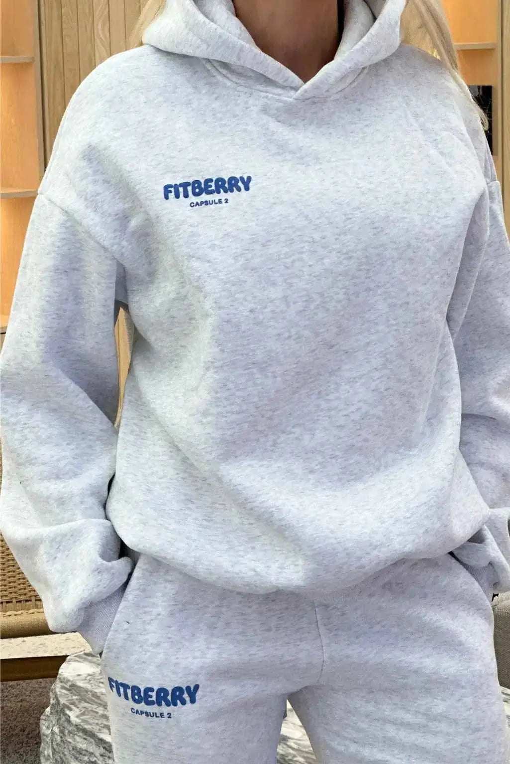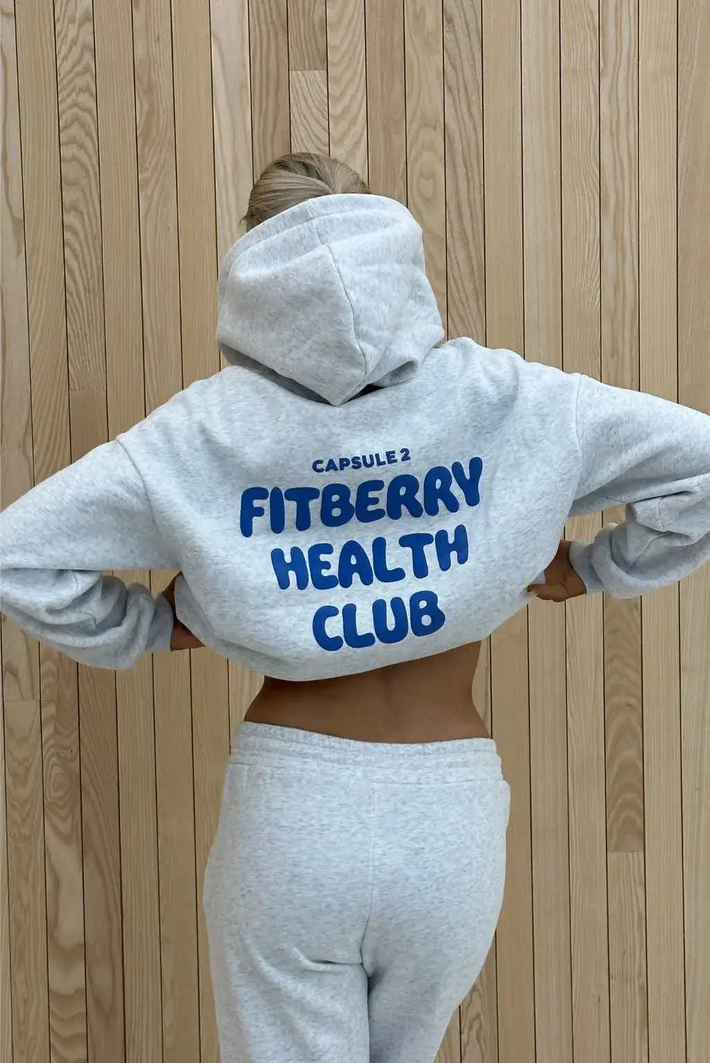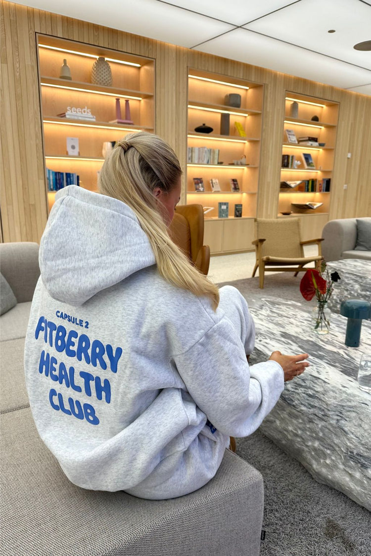 FITBERRY® HEALTH CLUB OVERSIZED HOODIE. An oversized hoodie crafted from a premium high-quality cotton fabric. The hoodie has a soft fleece interior, dropped shoulders, a cozy hood and ribbed details on the sleeves and waist. Featuring our signature Fitberry Health Club Capsule 2 logo to front and back.