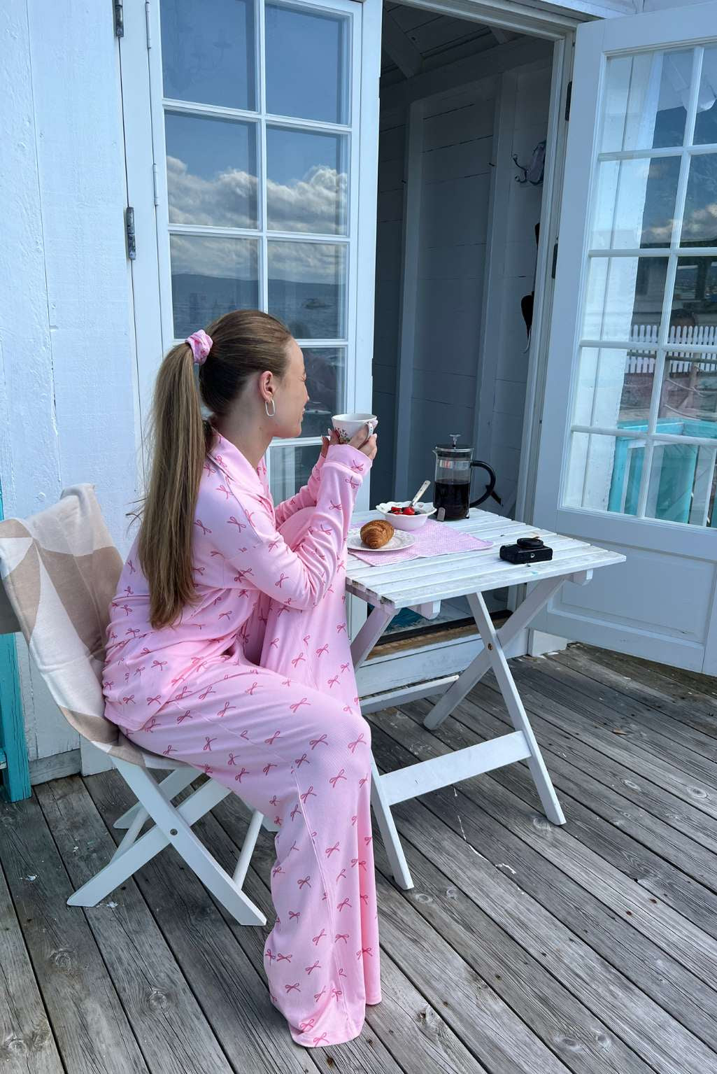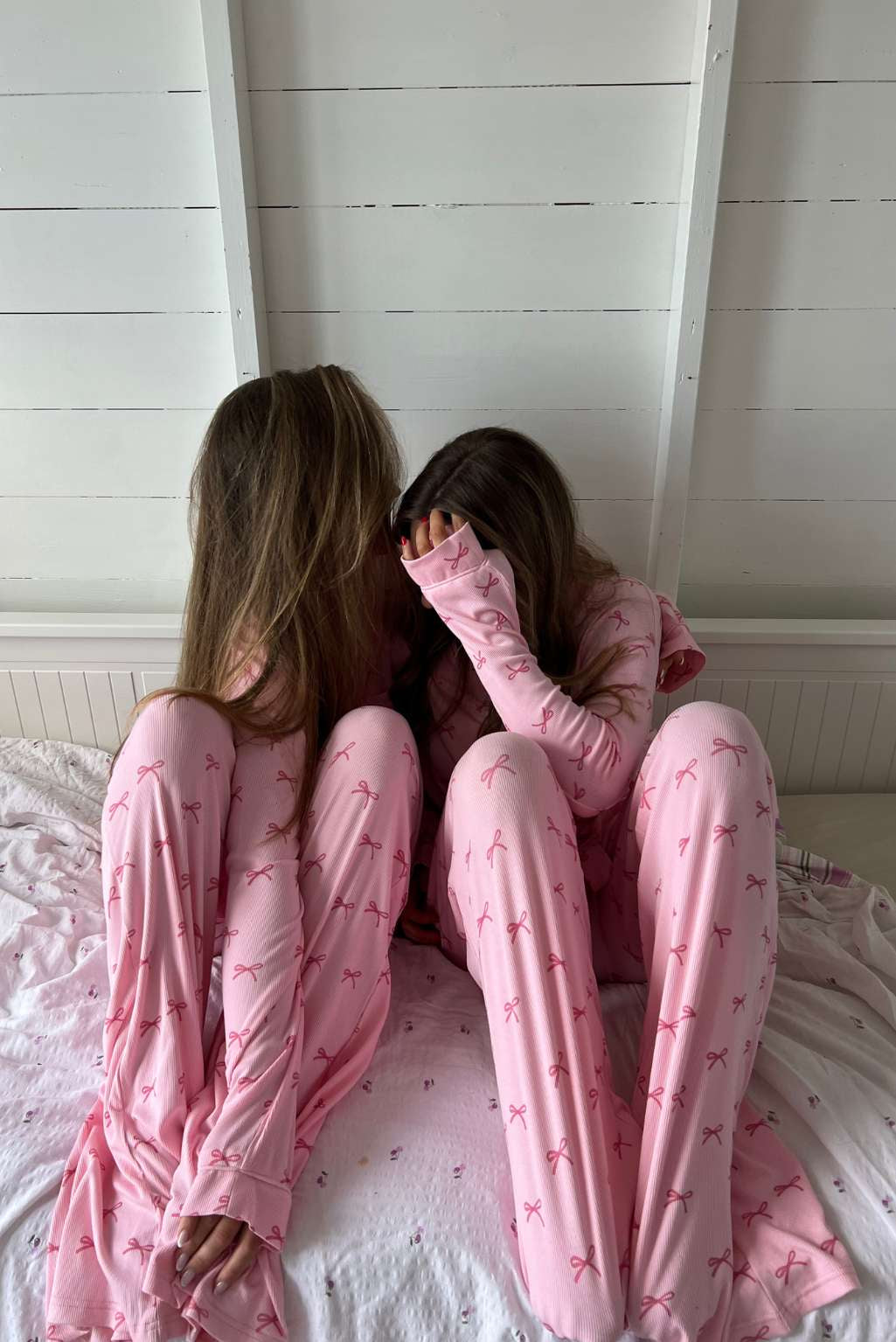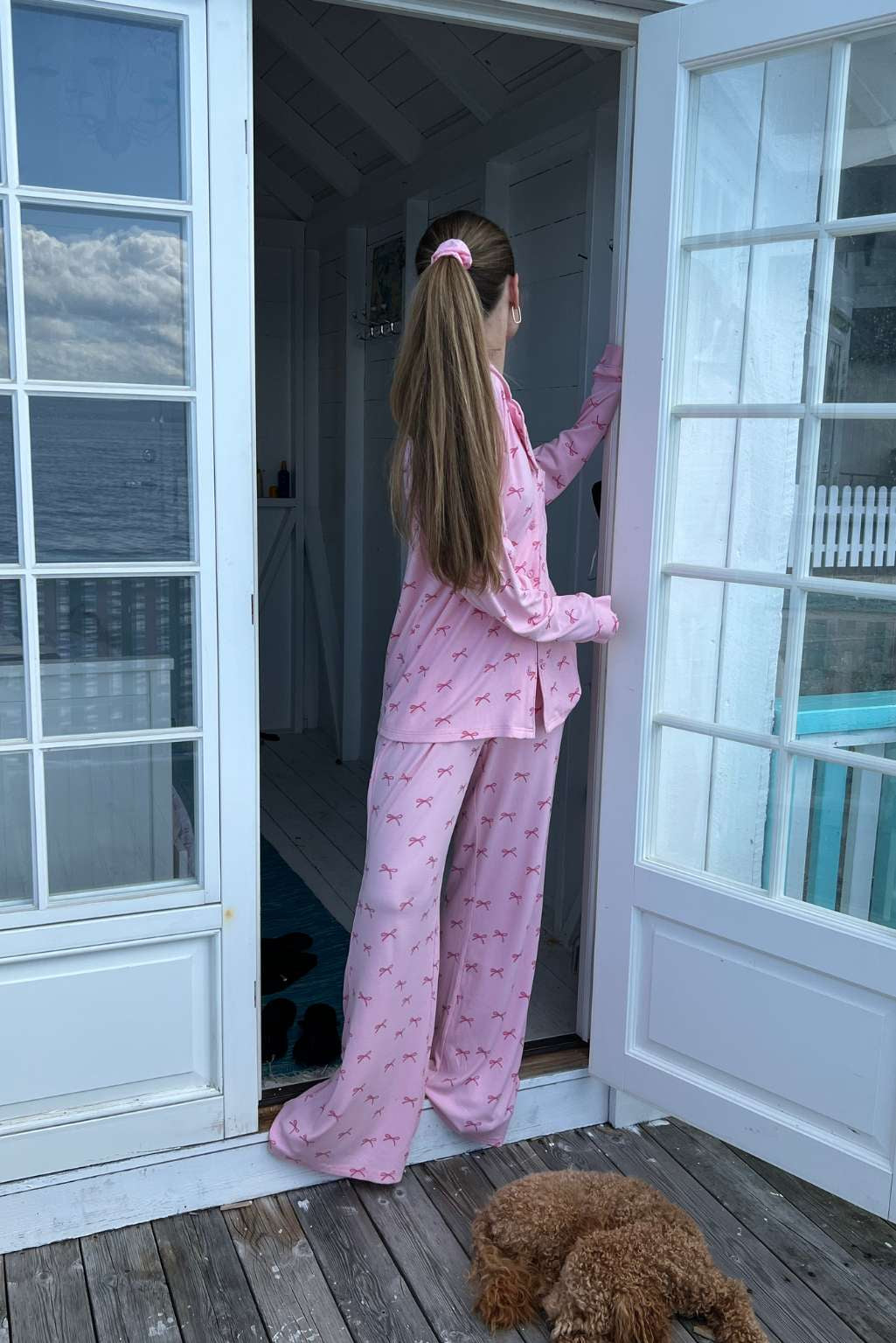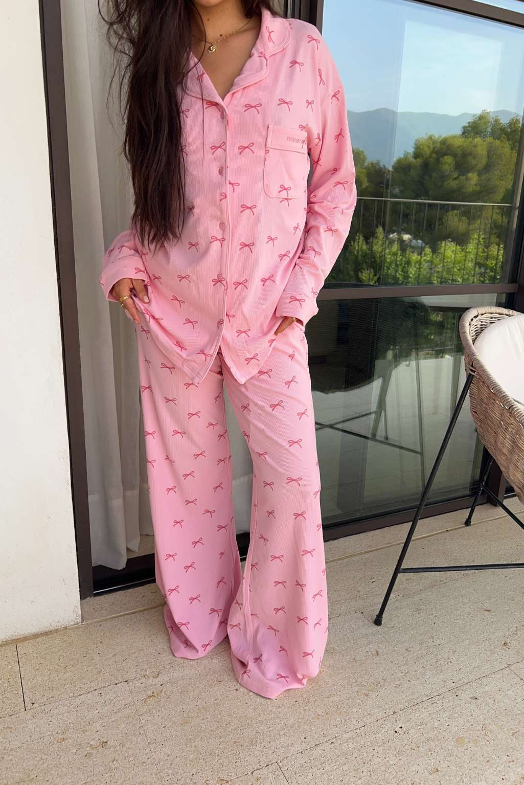 FITBERRY® RIBBON BLISS PYJAMAS PANTS. The softest pyjamas pants featuring ribbon print, wide leg, hidden elastic drawstring waist and deep pockets. Crafted from a ultra soft and stretchy modal rib fabric.