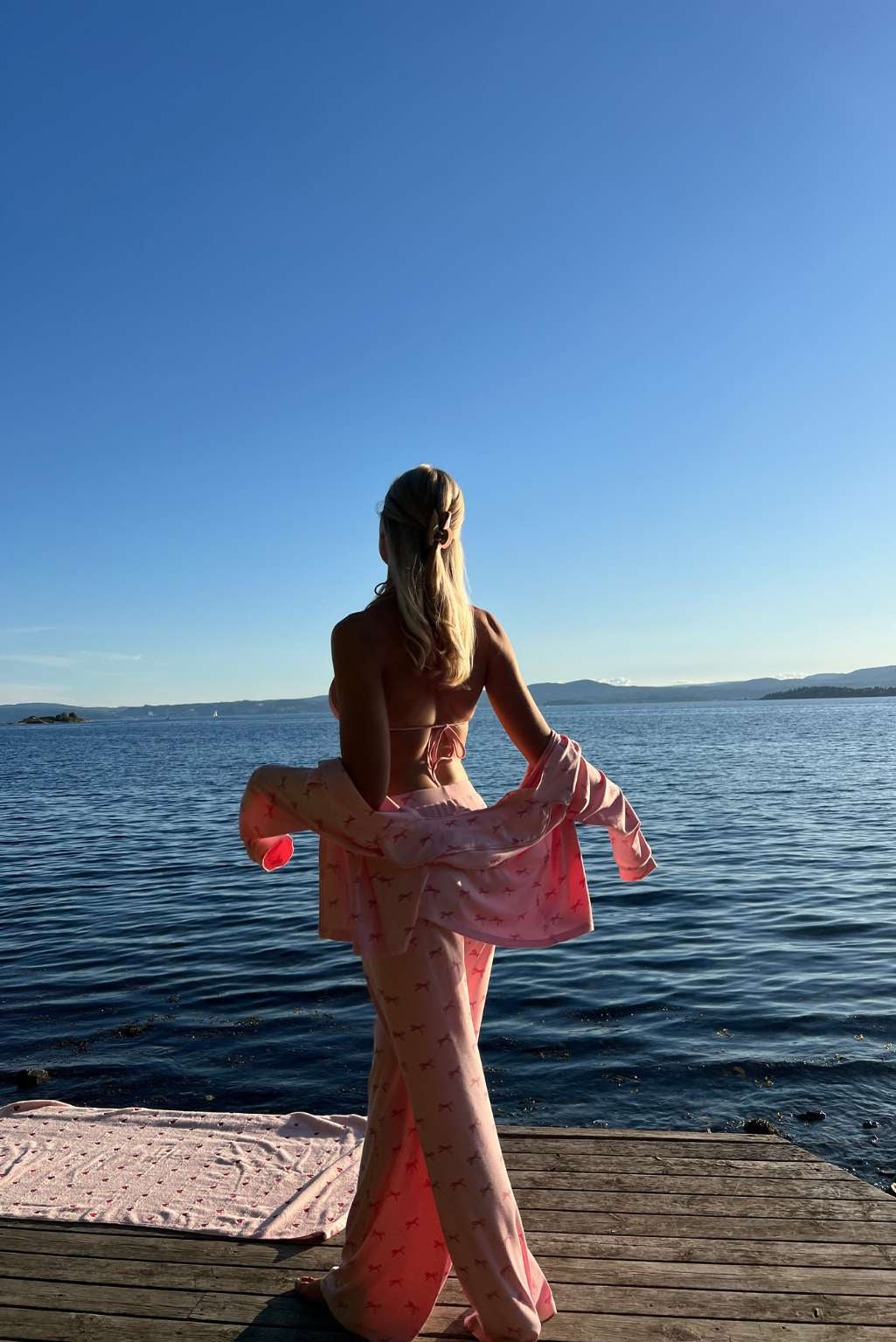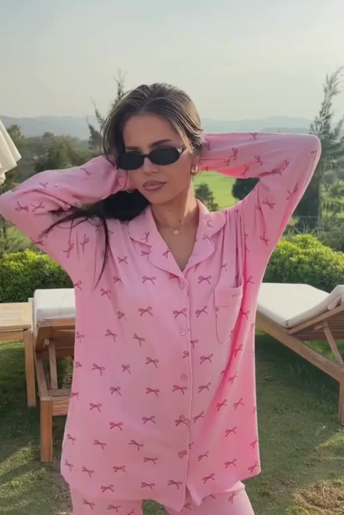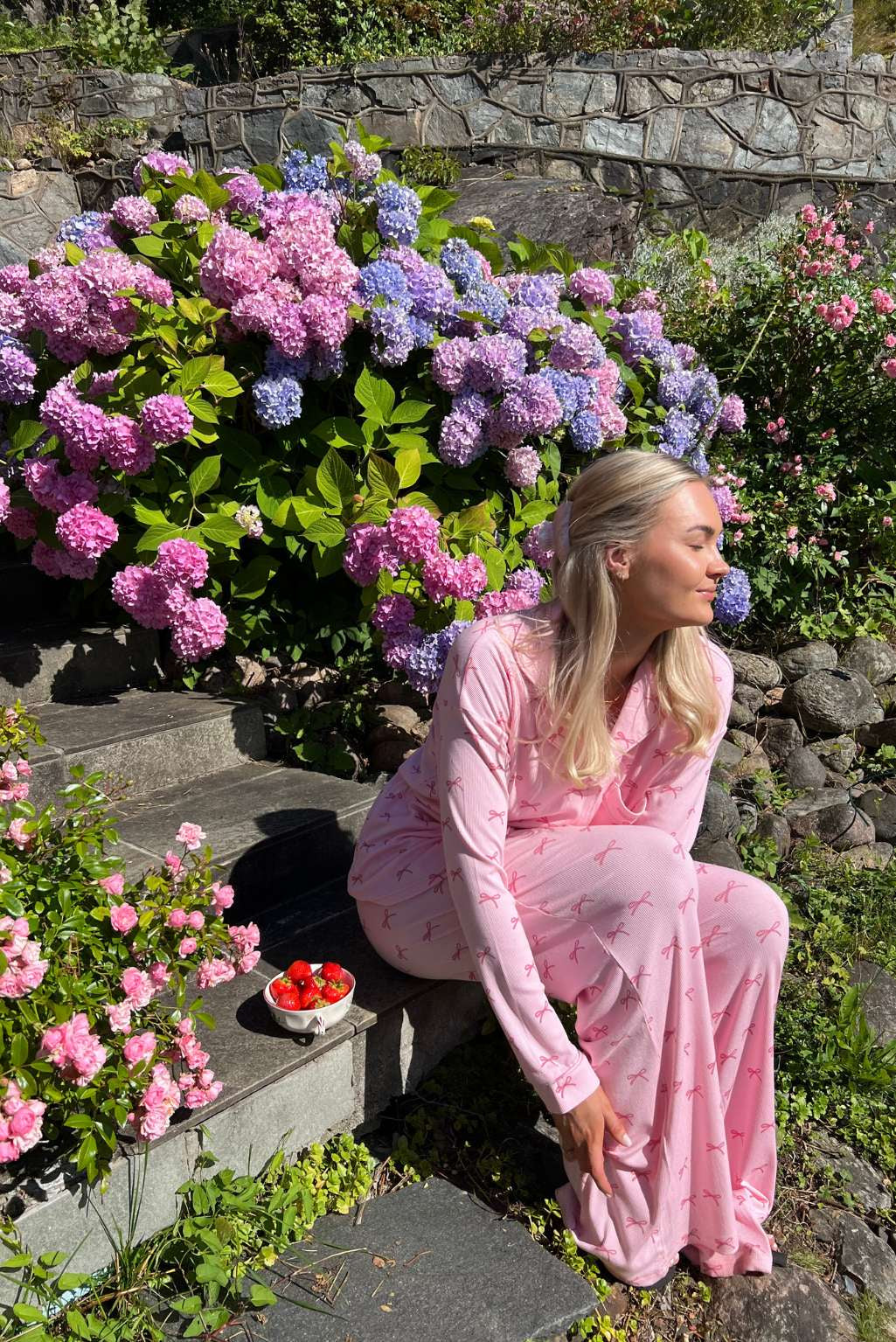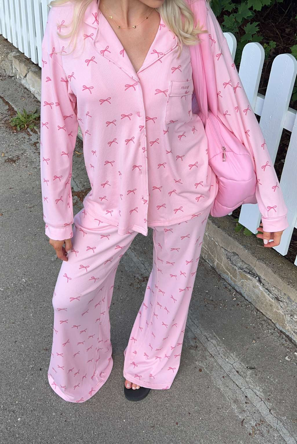 FITBERRY® RIBBON BLISS PYJAMAS PANTS. The softest pyjamas pants featuring ribbon print, wide leg, hidden elastic drawstring waist and deep pockets. Crafted from a ultra soft and stretchy modal rib fabric.