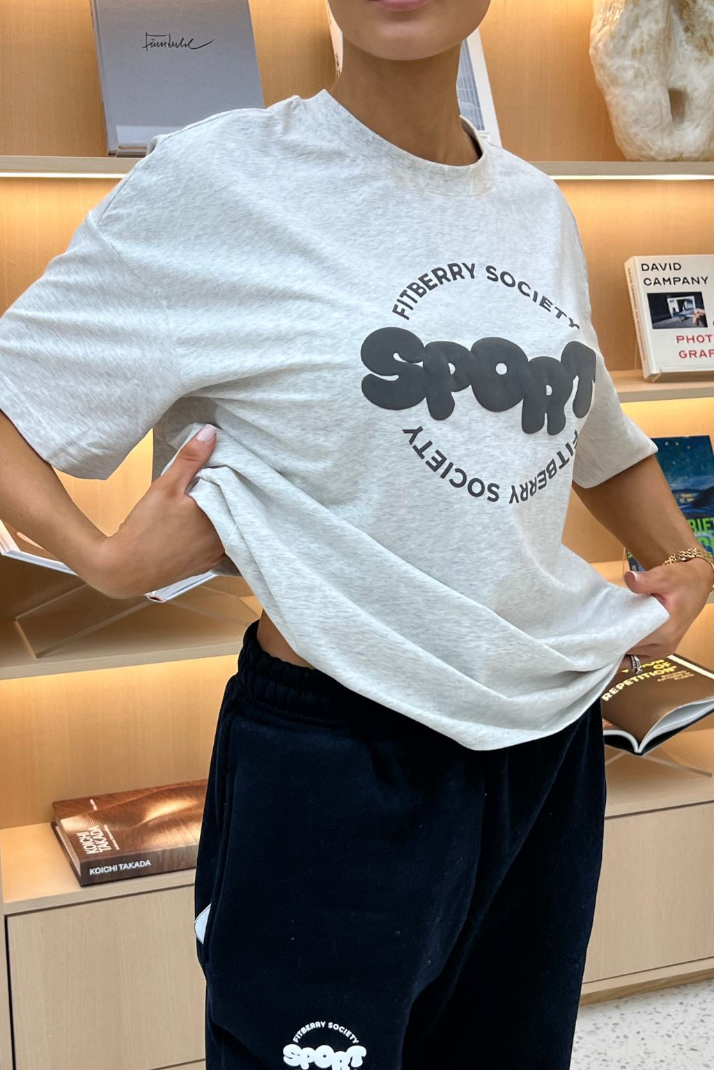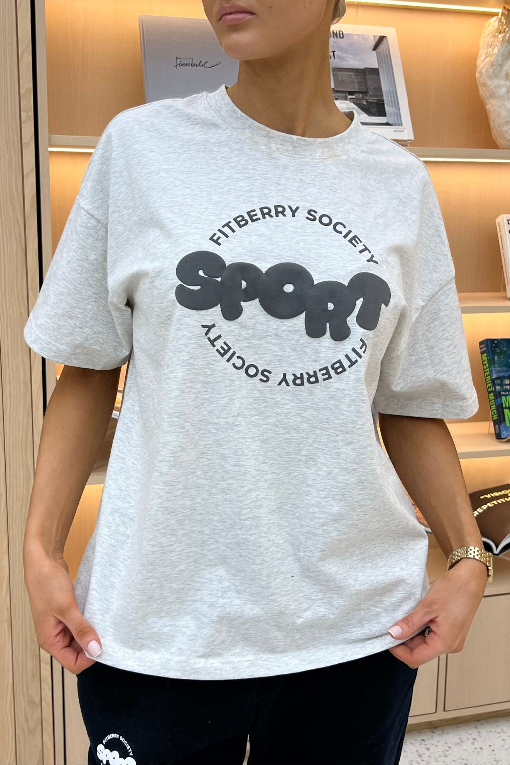 FITBERRY® SPORT SOCIETY OVERSIZED TEE. A t-shirt with an oversized fit. Crafted from a premium high-quality cotton fabric with a soft handfeel. The tee has a round neckline, dropped shoulders, loose sleeves and Fitberry logo to front.