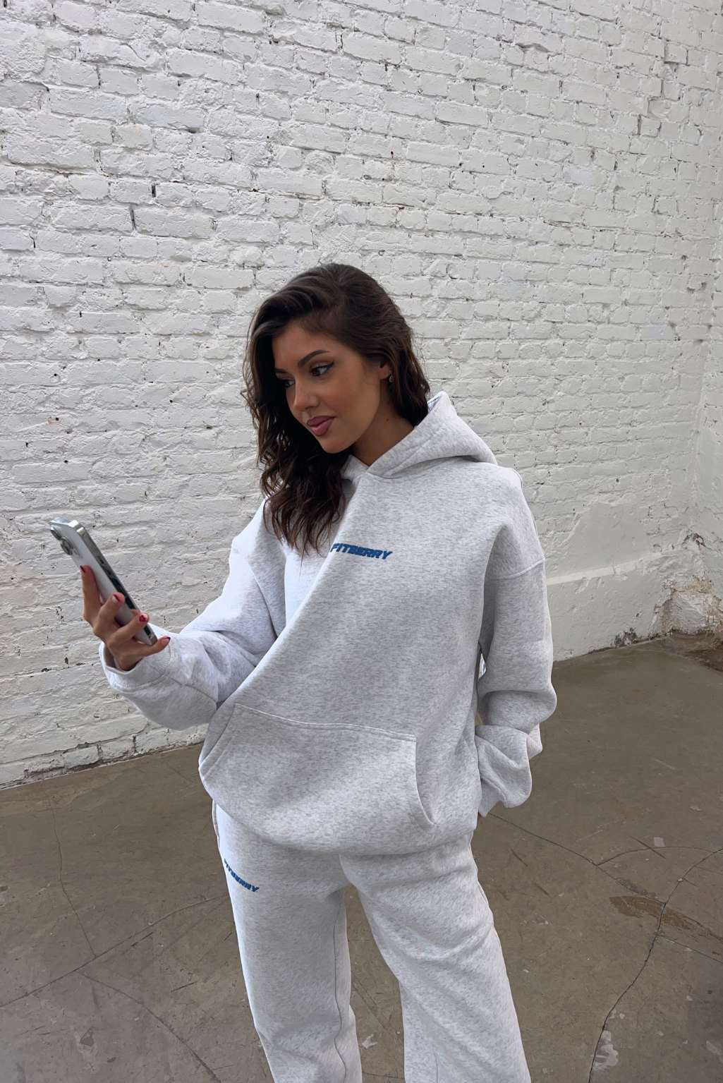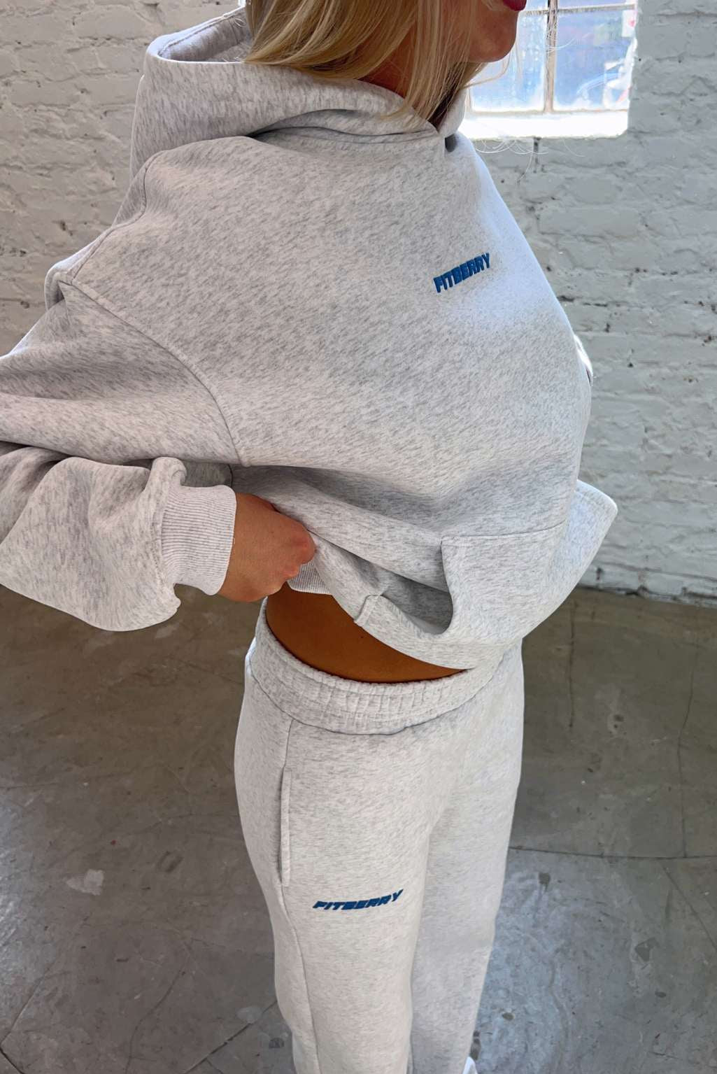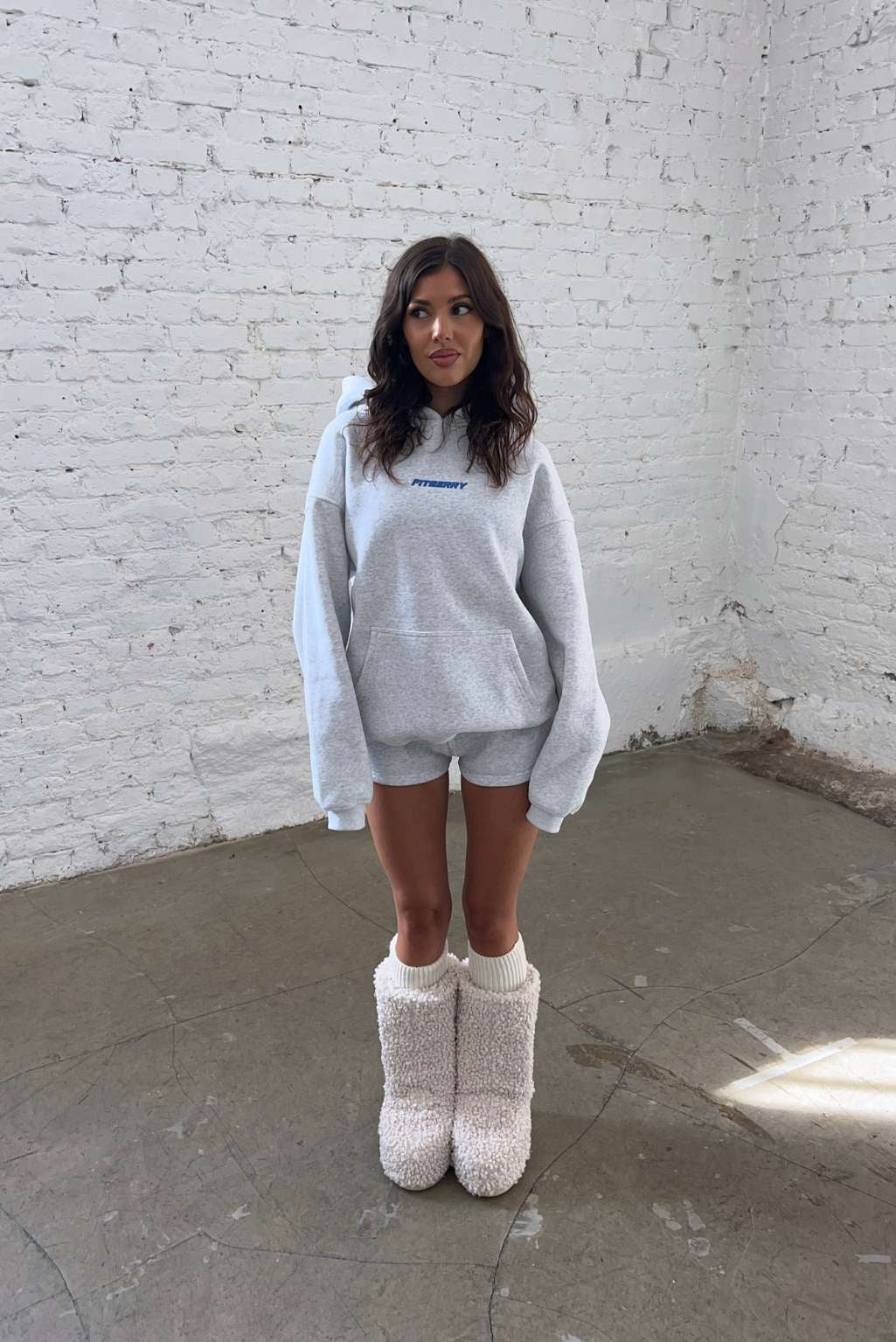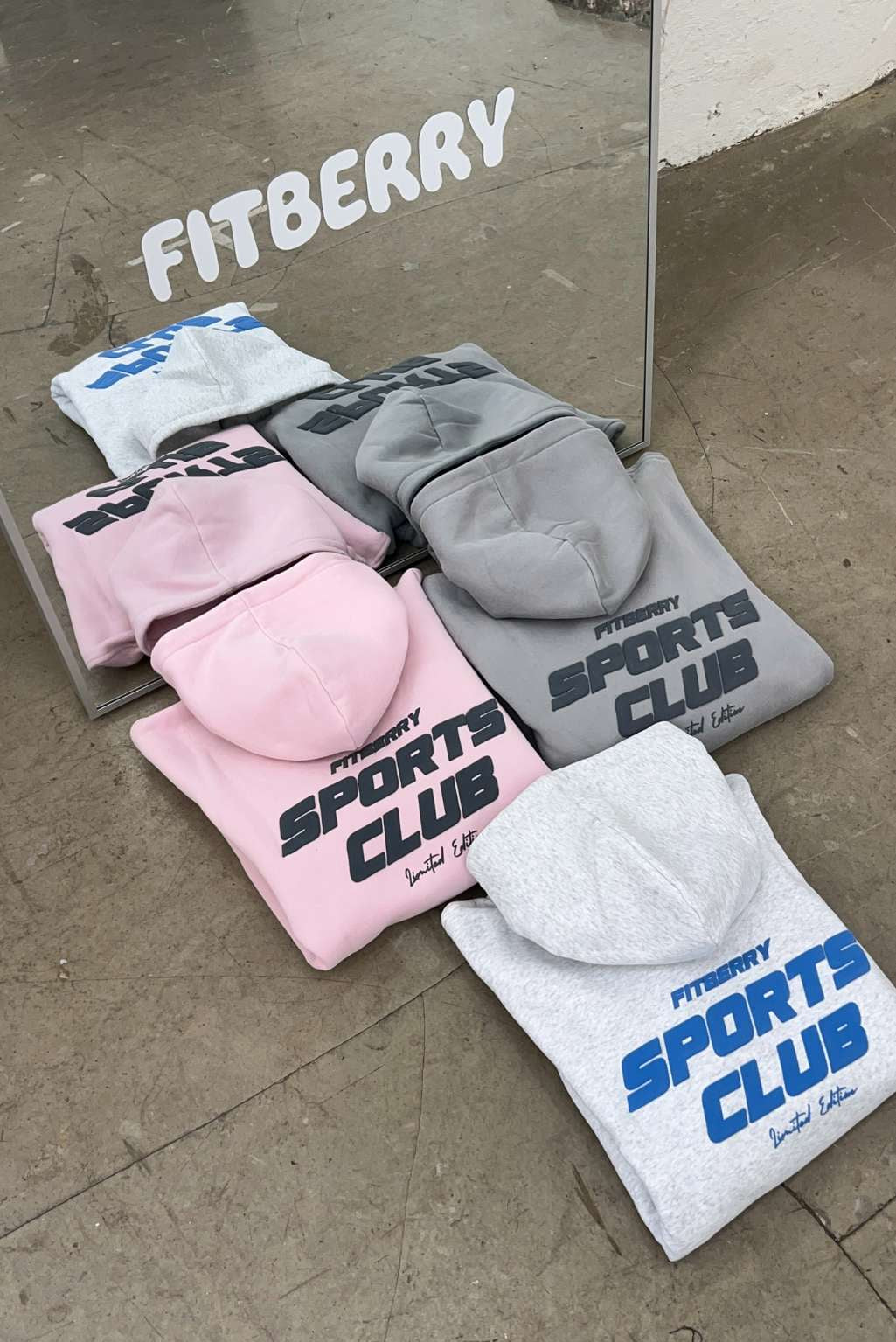 FITBERRY® SPORTS CLUB OVERSIZED HOODIE. An oversized hoodie crafted from premium high-quality cotton fabric. The hoodie has a soft fleece interior, dropped shoulders, a cozy hood, front pocket and ribbed details on the sleeves and waist. Featuring Fitberry Sports Club print to front and back.