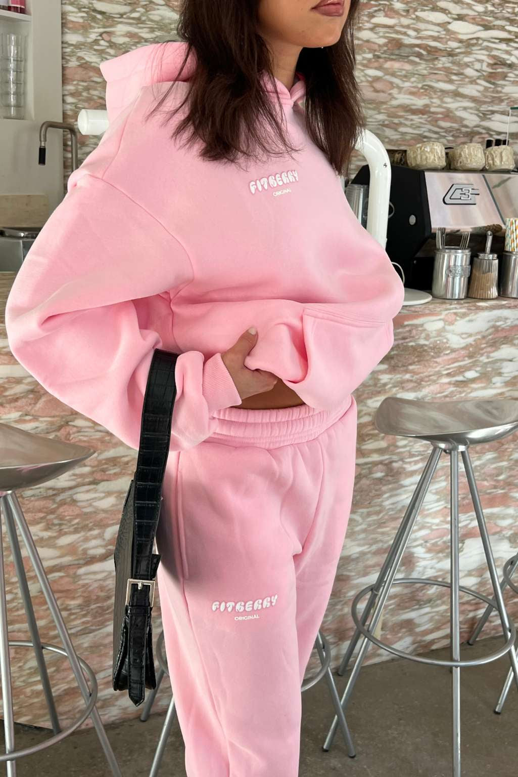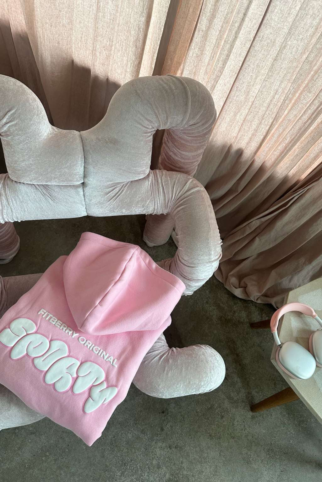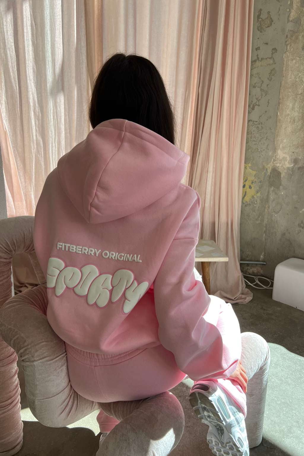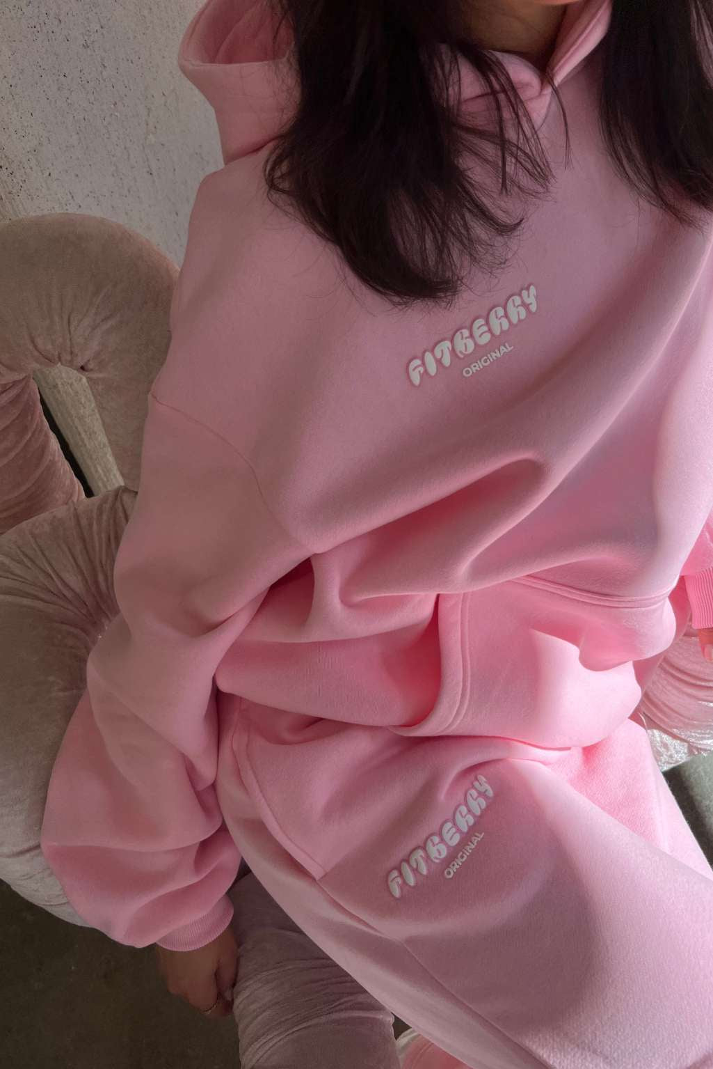 FITBERRY® SPORTY OVERSIZED HOODIE. An oversized hoodie crafted from premium high-quality cotton fabric. The hoodie has a soft fleece interior, dropped shoulders, a cozy hood, front pocket and ribbed details on the sleeves and waist. Featuring Fitberry Sporty print to front and back.