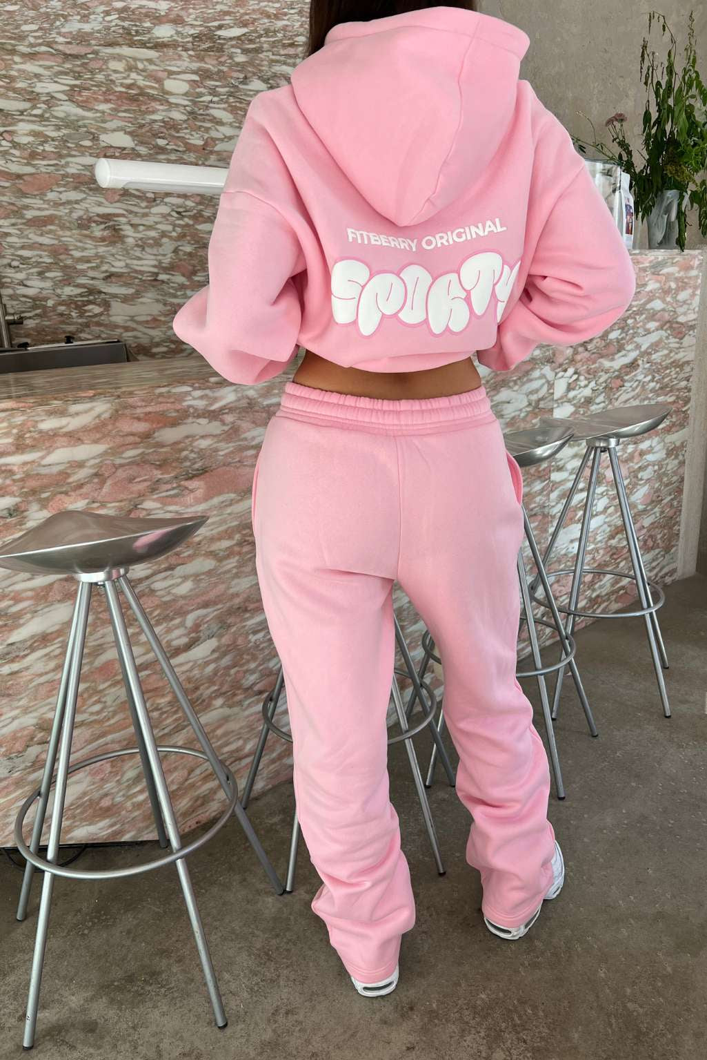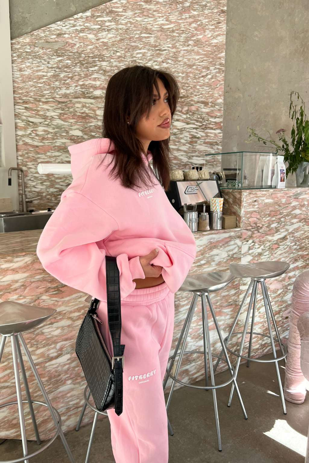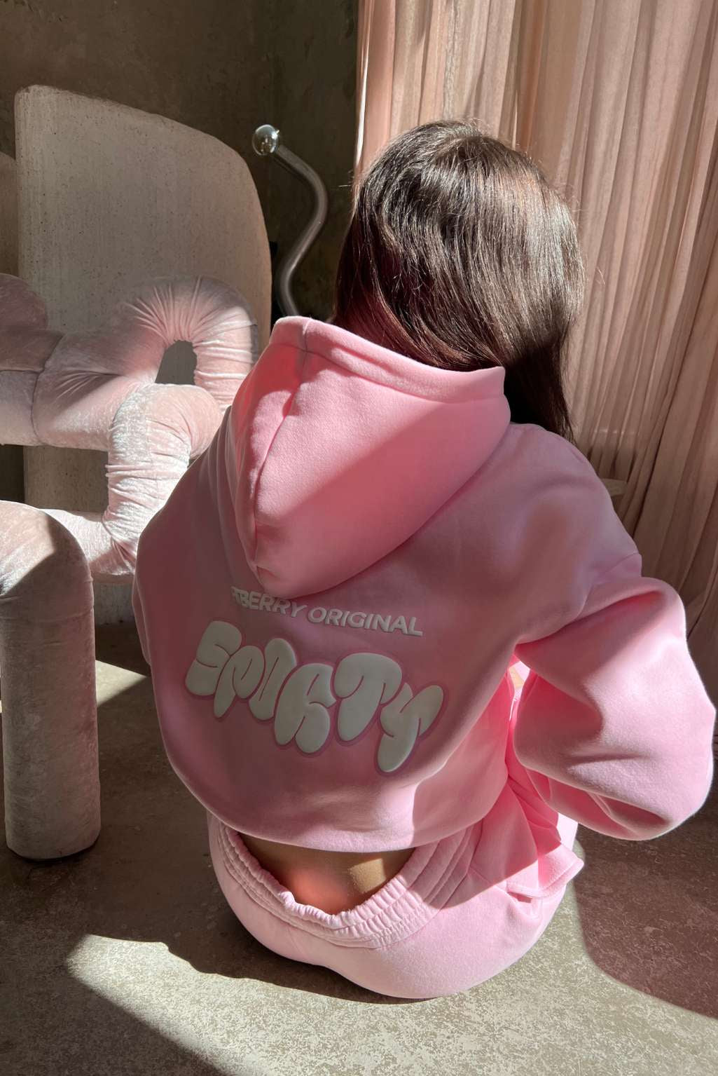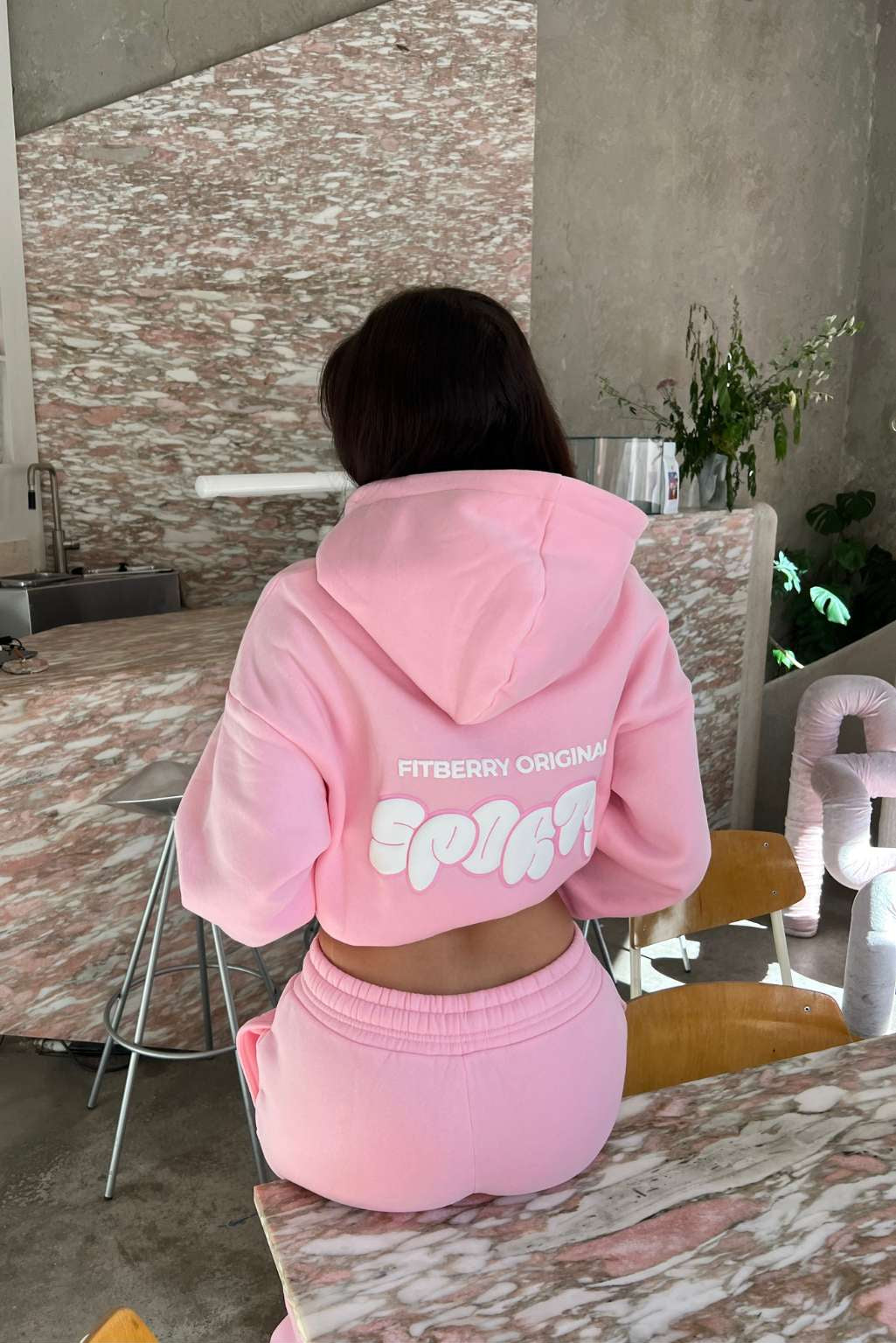 FITBERRY® SPORTY OVERSIZED HOODIE. An oversized hoodie crafted from premium high-quality cotton fabric. The hoodie has a soft fleece interior, dropped shoulders, a cozy hood, front pocket and ribbed details on the sleeves and waist. Featuring Fitberry Sporty print to front and back.