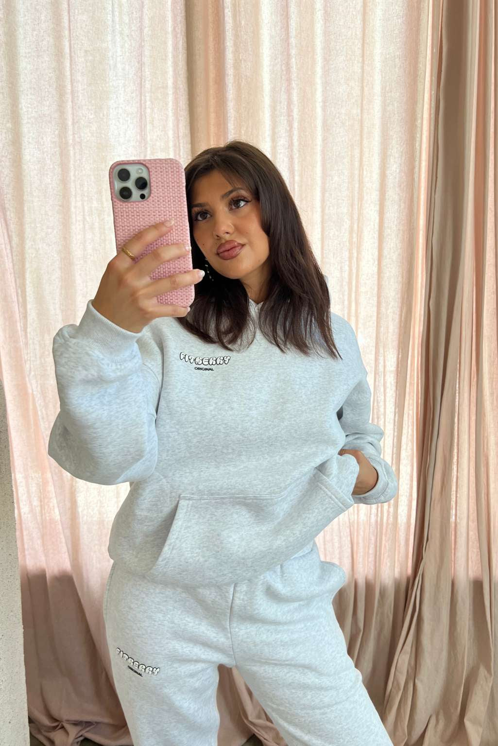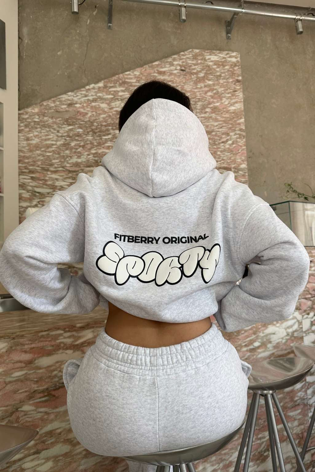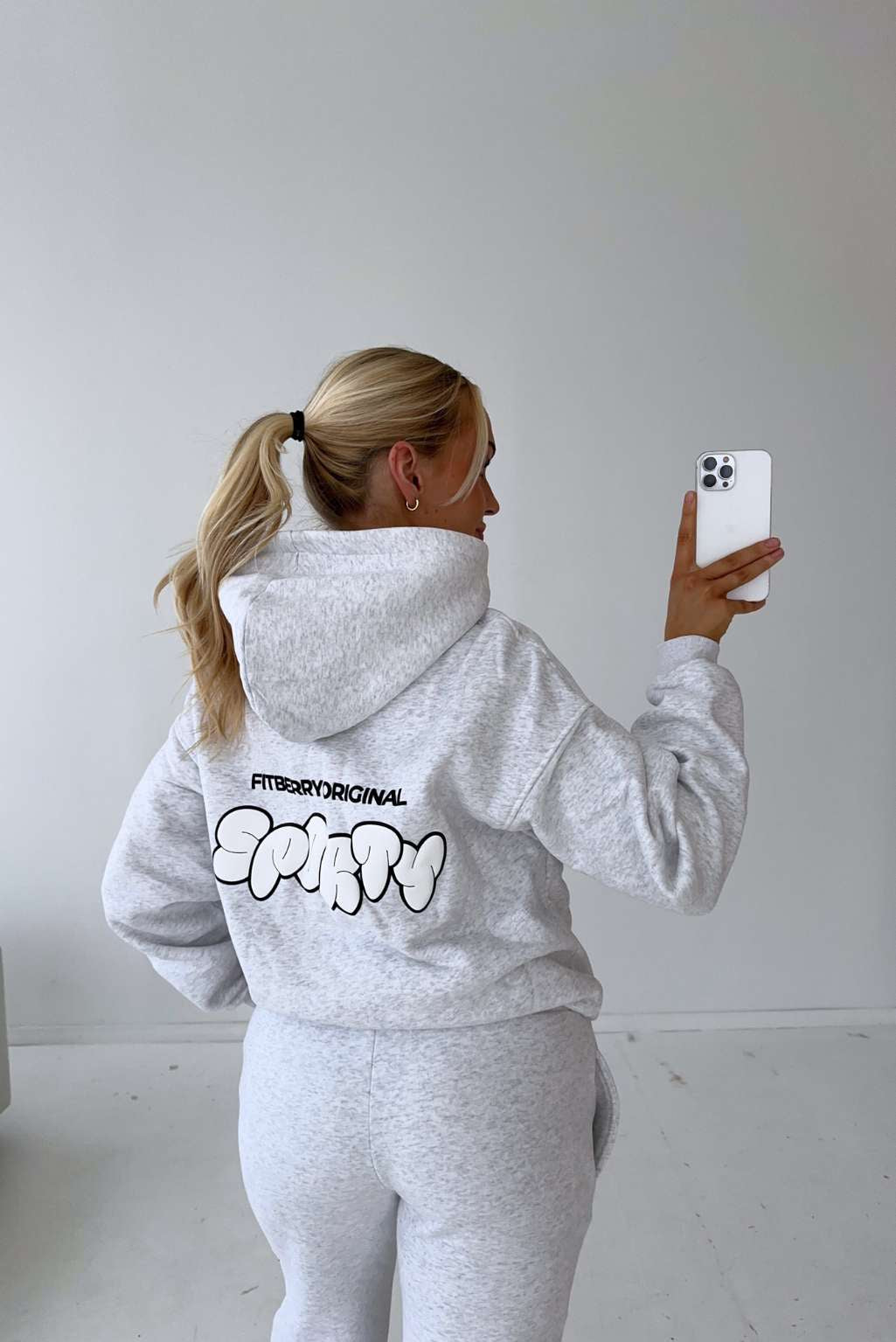 FITBERRY® SPORTY OVERSIZED HOODIE. An oversized hoodie crafted from premium high-quality cotton fabric. The hoodie has a soft fleece interior, dropped shoulders, a cozy hood, front pocket and ribbed details on the sleeves and waist. Featuring Fitberry Sporty print to front and back.