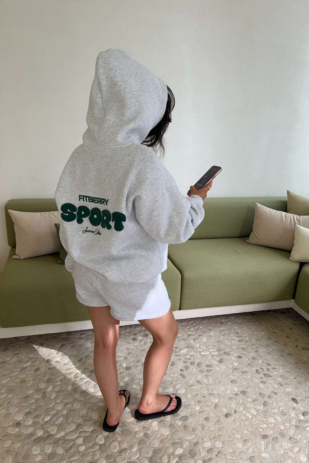 FITBERRY® SUMMER EDITION OVERSIZED HOODIE. An oversized hoodie crafted from premium high-quality cotton fabric. The hoodie has a soft fleece interior, dropped shoulders, a cozy hood, front pocket and ribbed details on the sleeves and waist. Featuring Fitberry Summer Edition print to front and back.