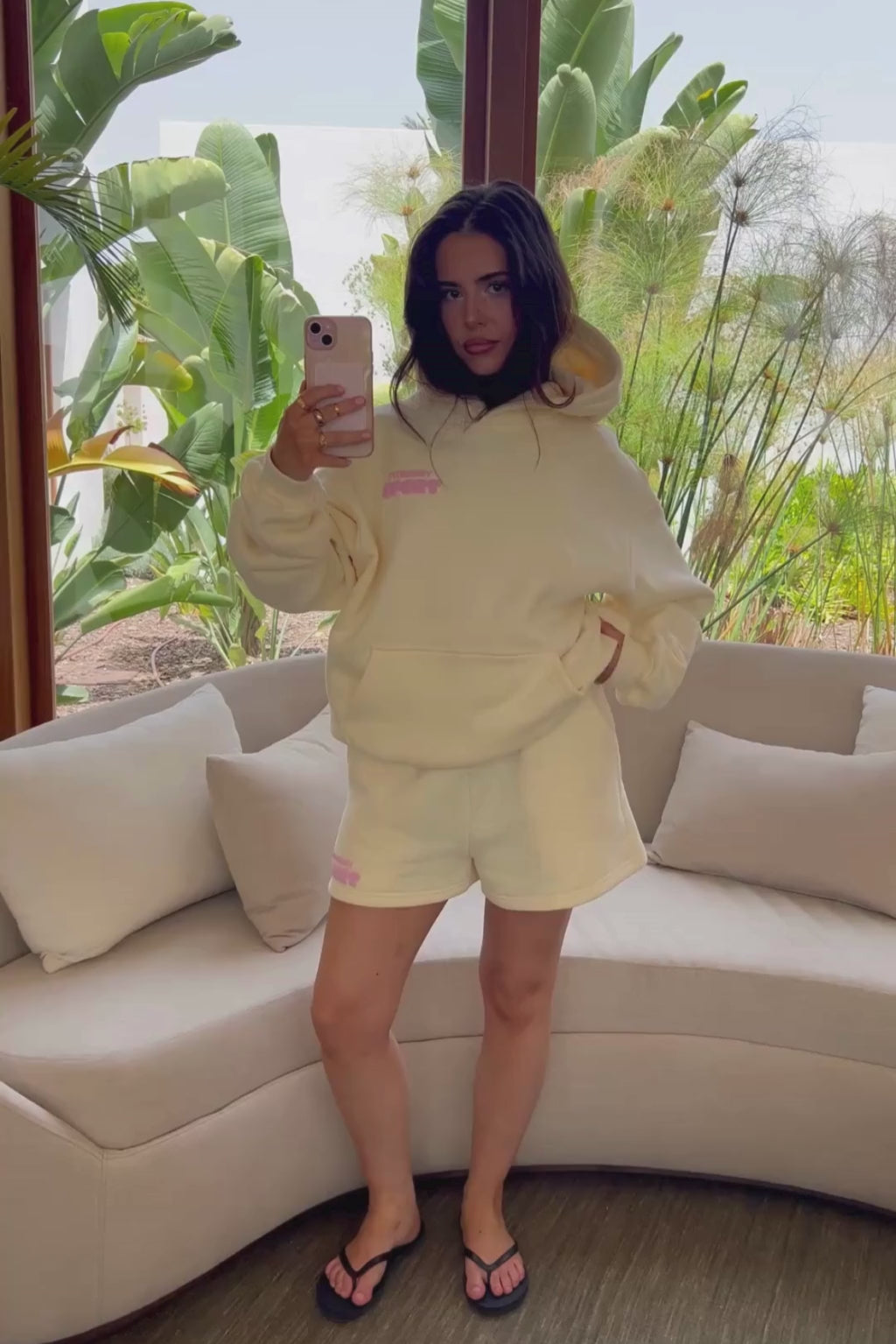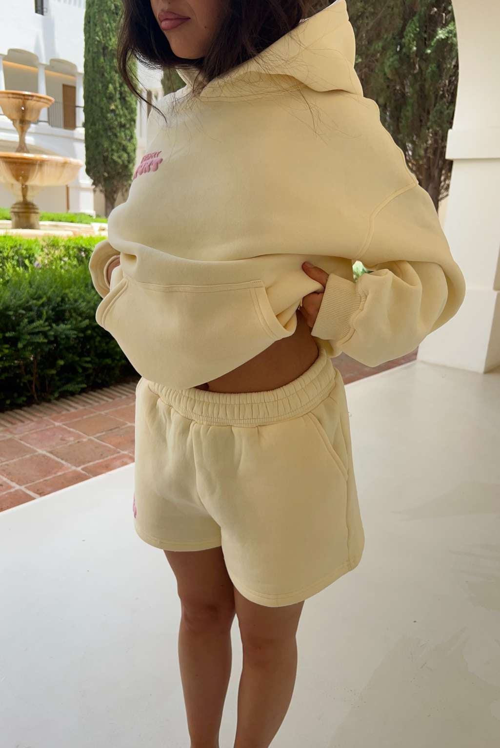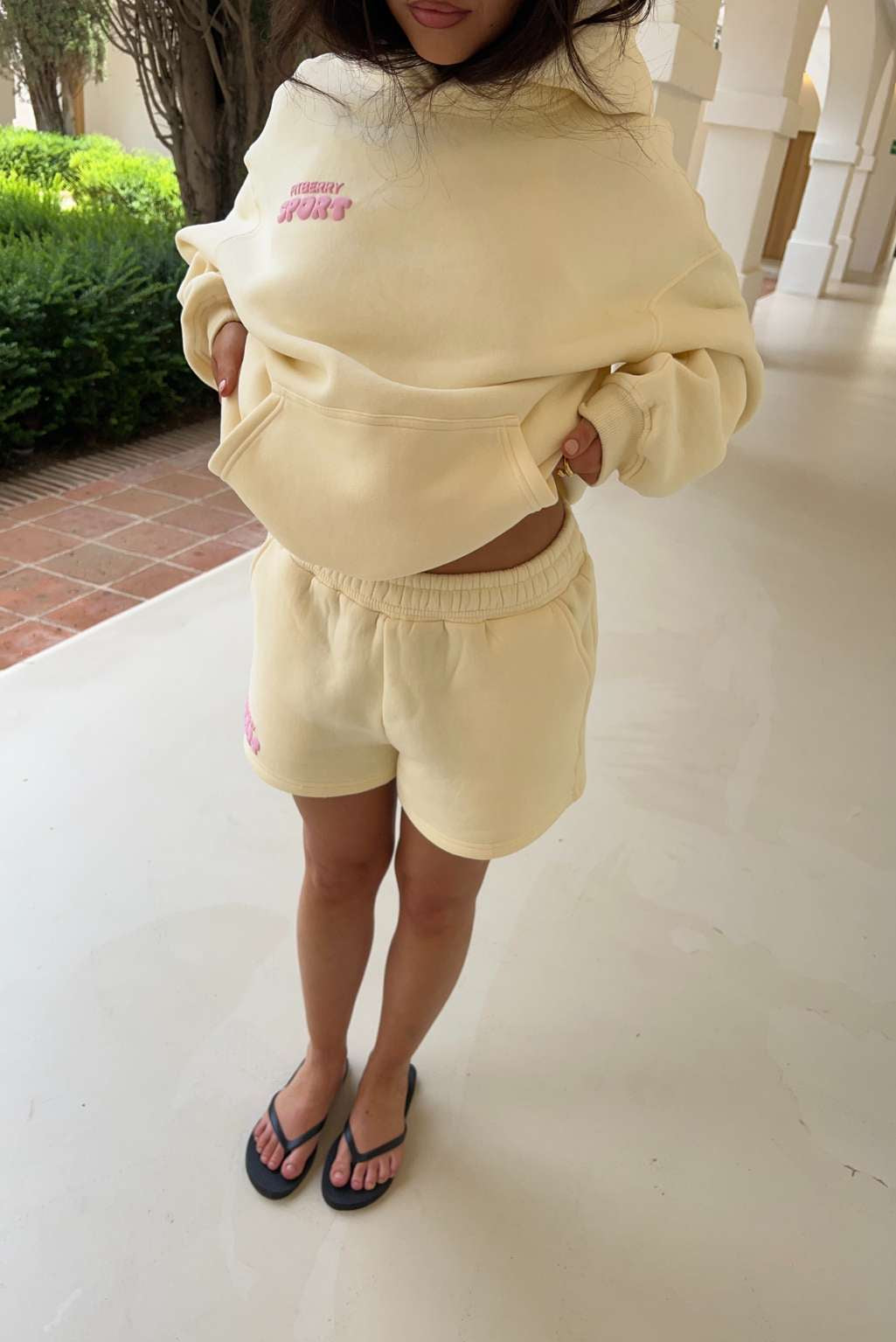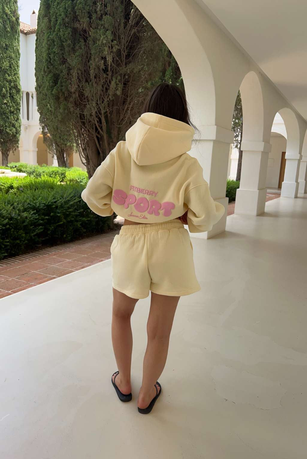 FITBERRY® SUMMER EDITION SHORTS. Shorts with a relaxed and slightly oversized fit crafted from a premium high-quality cotton fabric. The shorts feature a soft fleece interior, deep side pockets and a hidden adjustable drawstring. Featuring Fitberry Summer Edition print to front.