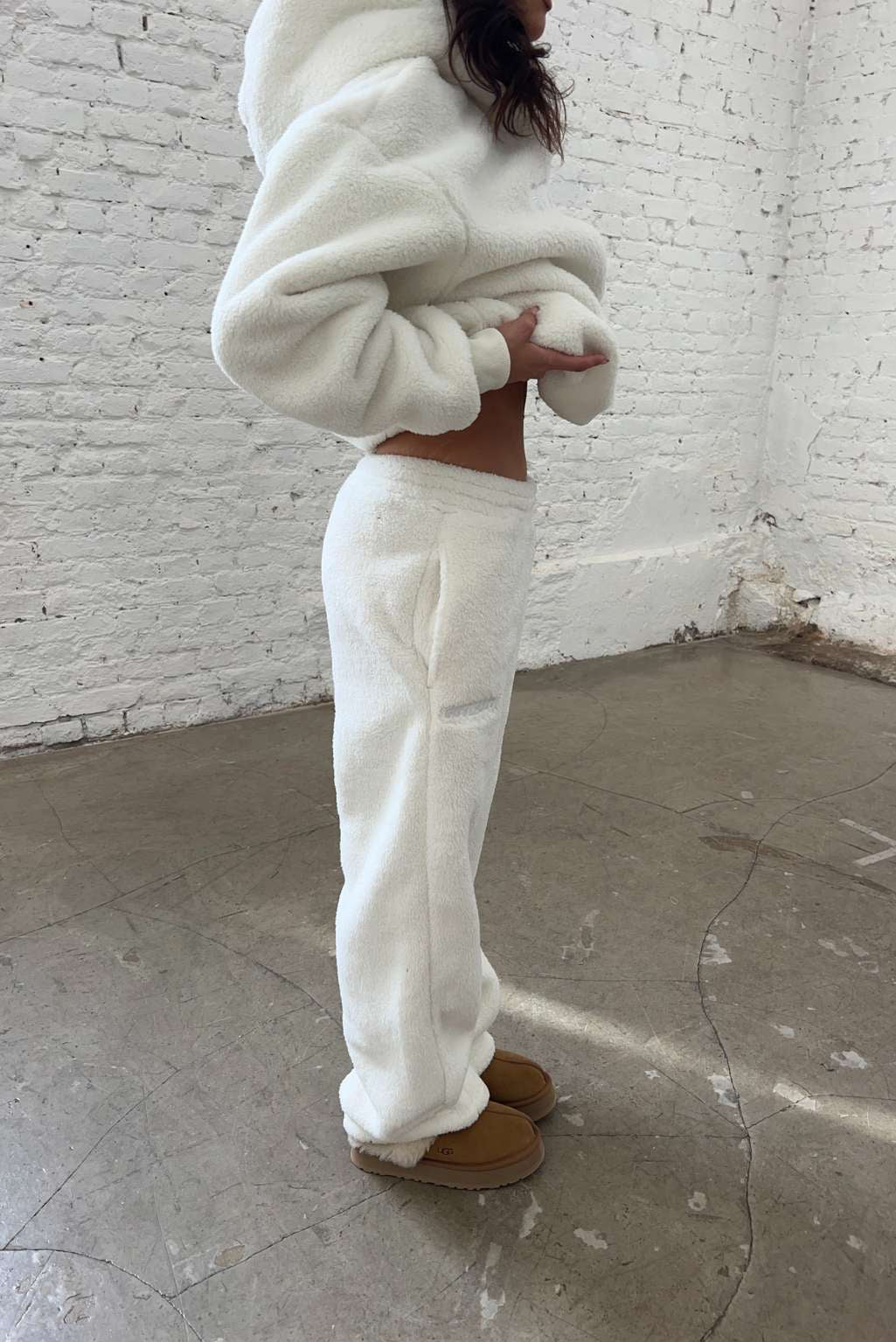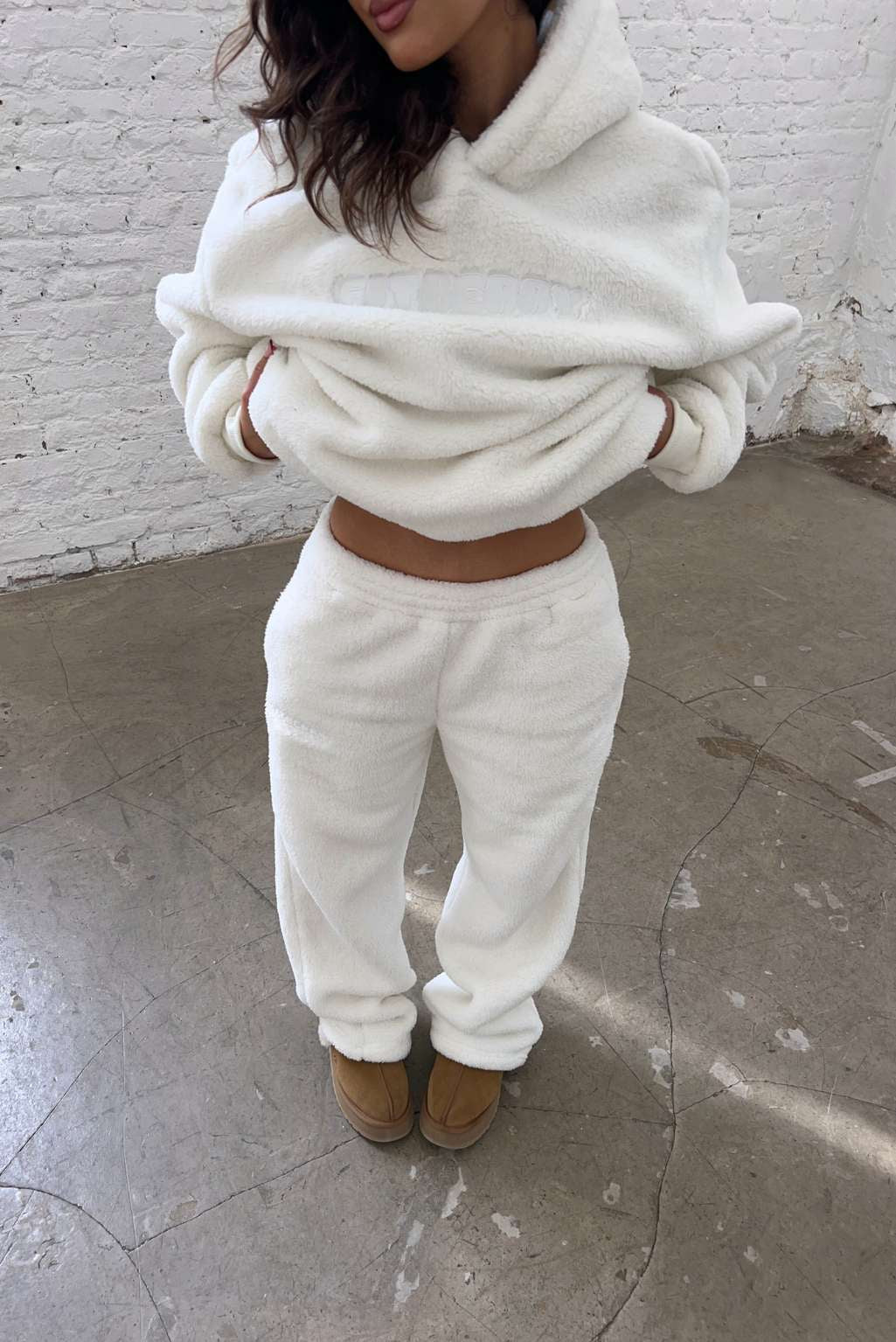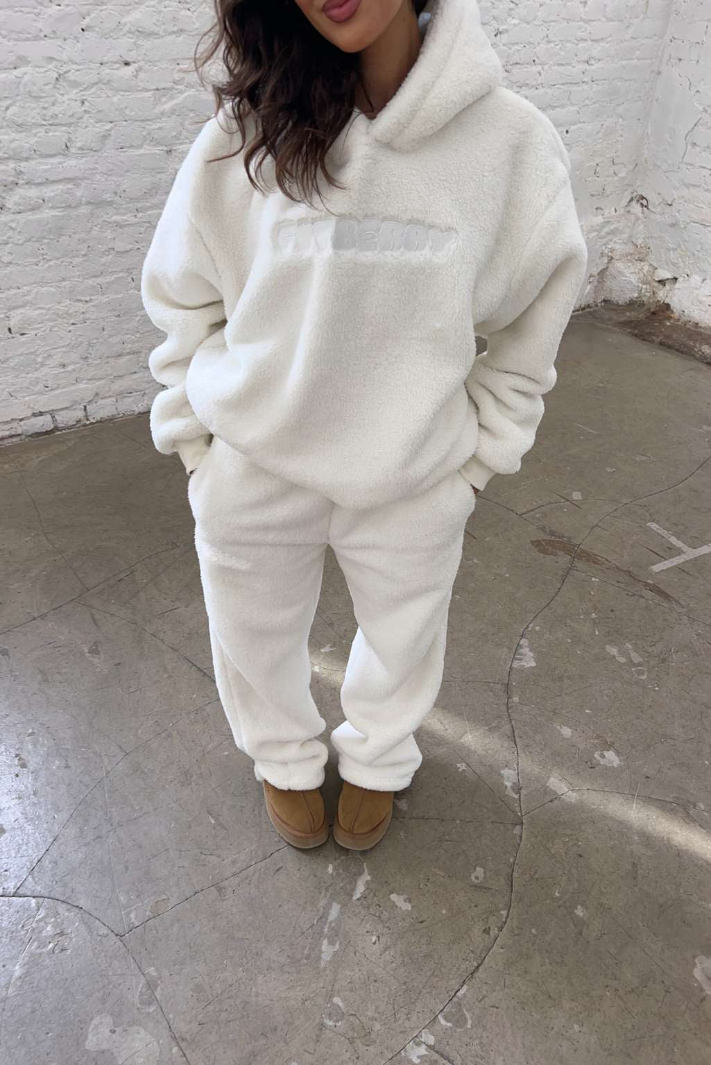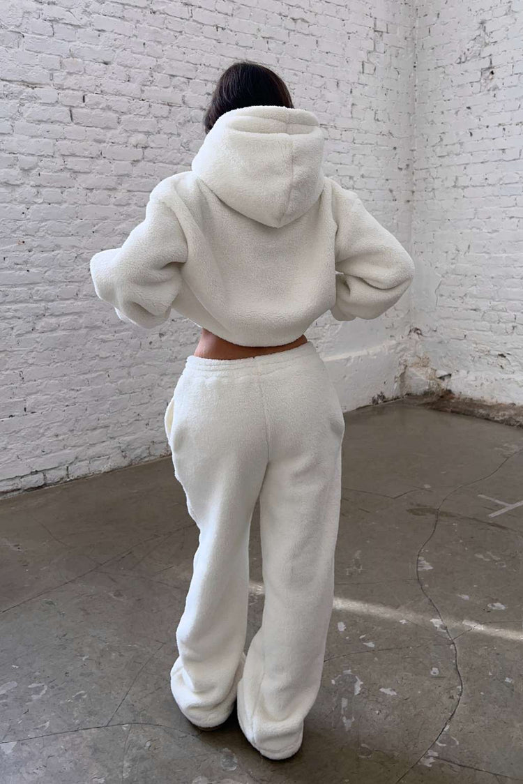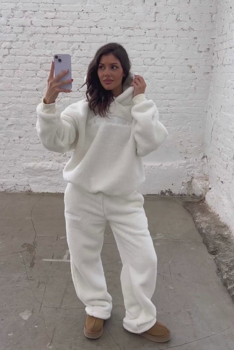 FITBERRY® SNOW BUNNY FLARED JOGGERS. Joggers with the perfect flared leg and a normal fit. Crafted from a buttery soft teddy fleece fabric. The flare joggers have soft fleece interior, deep pockets and an elastic waist. Featuring Fitberry embroidery logo to front.