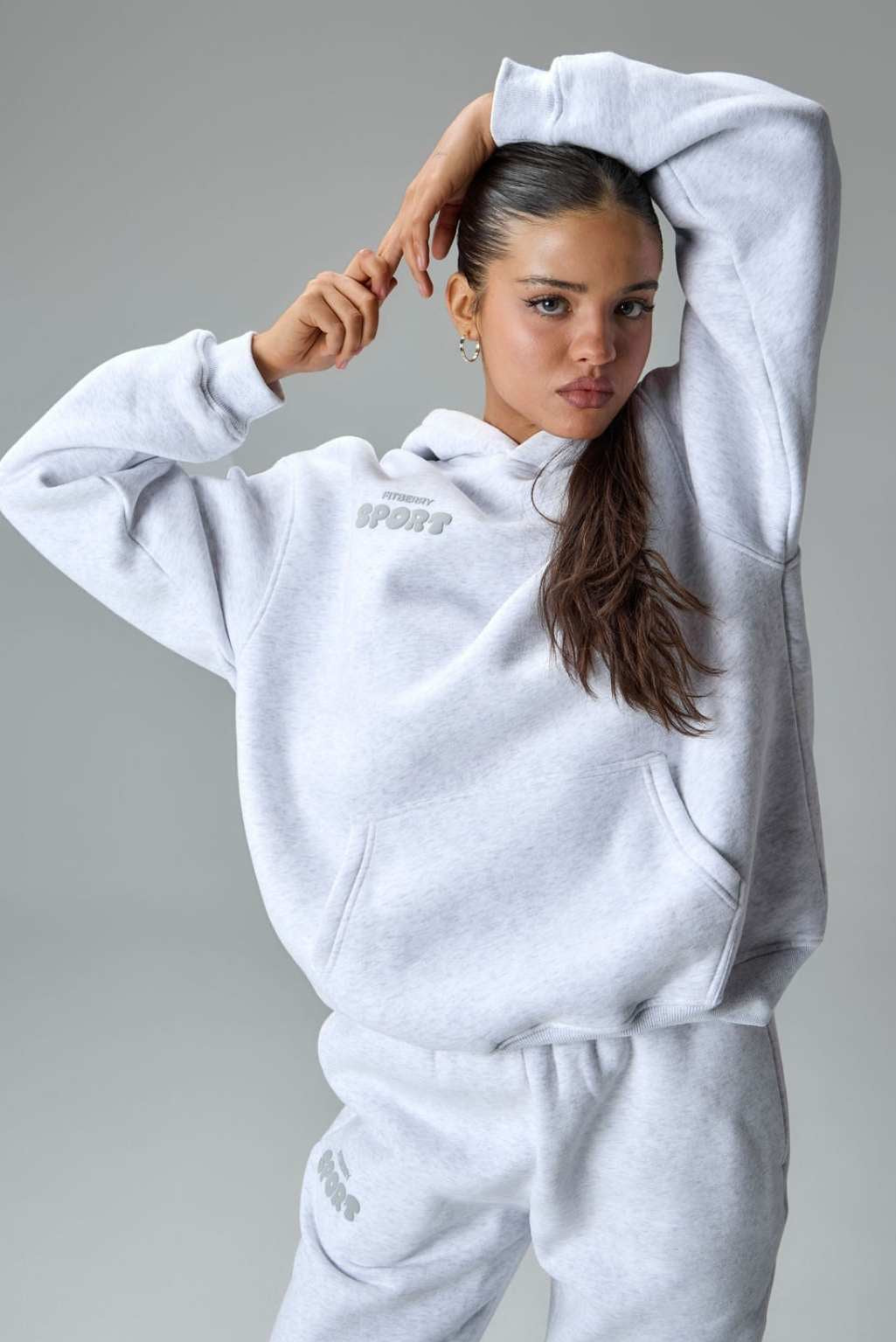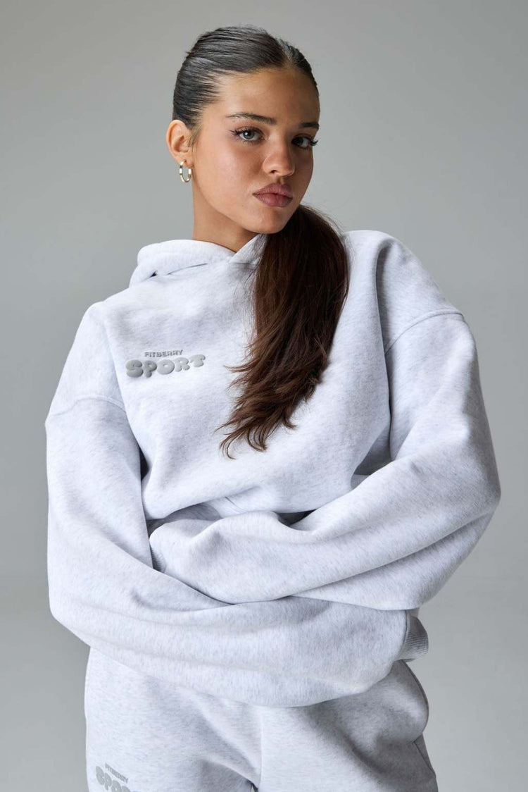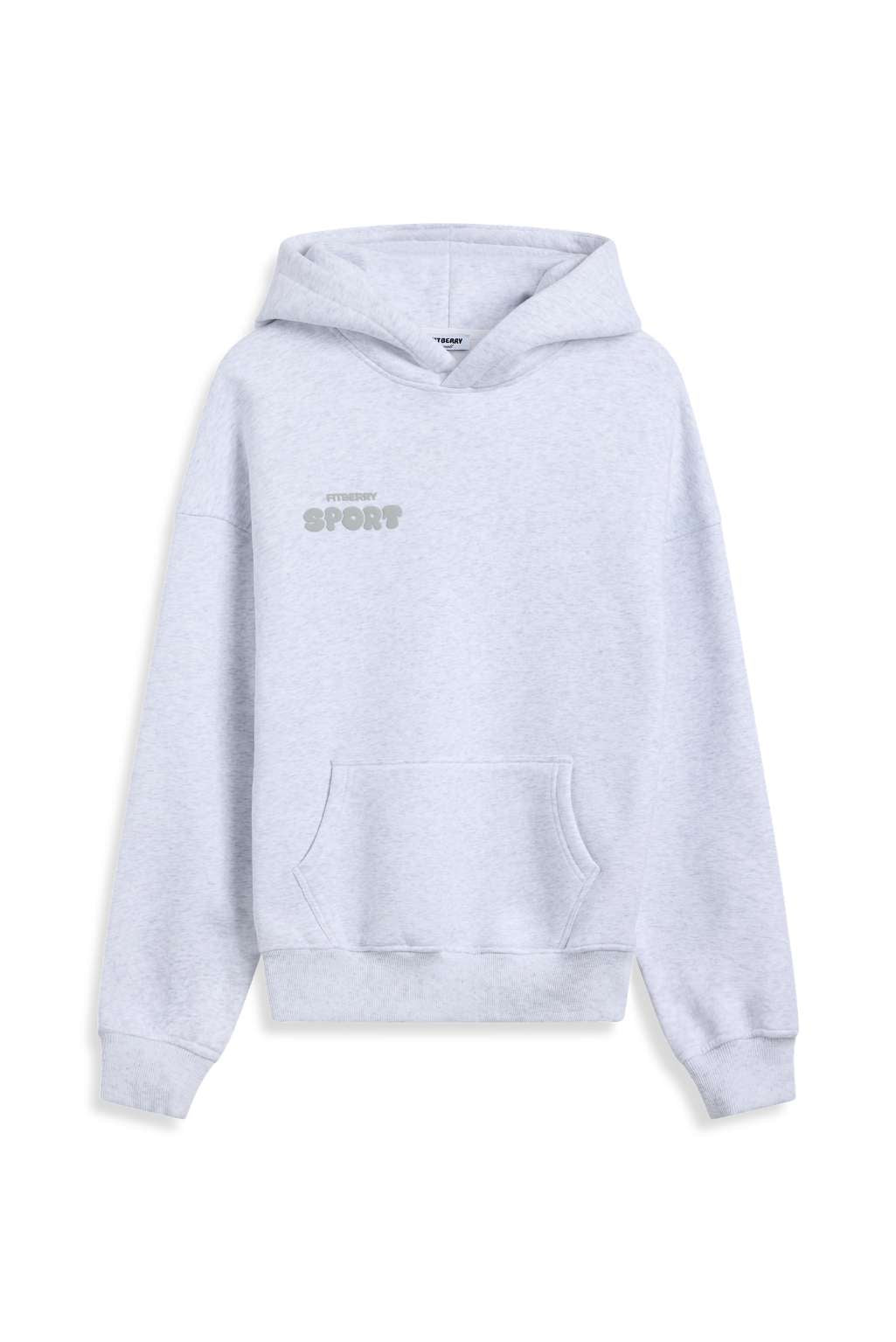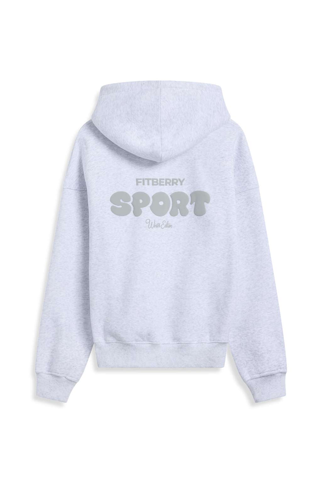 FITBERRY® WINTER EDITION OVERSIZED HOODIE. An oversized hoodie crafted from premium high-quality cotton fabric. The hoodie has a soft fleece interior, dropped shoulders, a cozy hood, front pocket and ribbed details on the sleeves and waist. Featuring our signature Fitberry Winter Edition print to front and back.